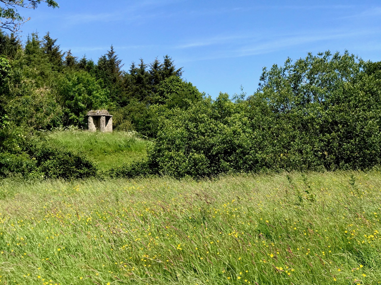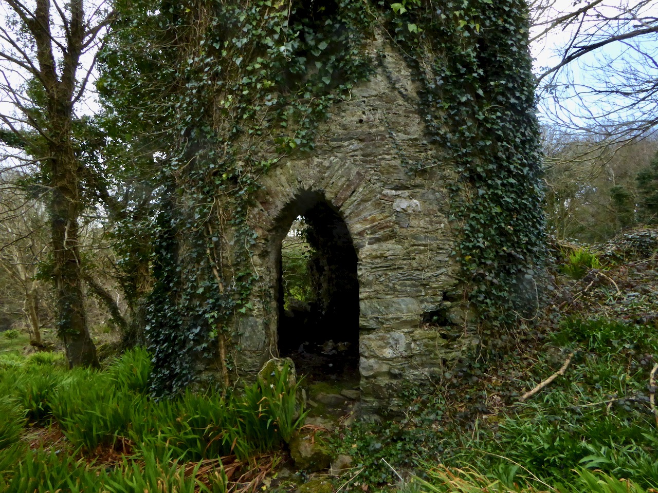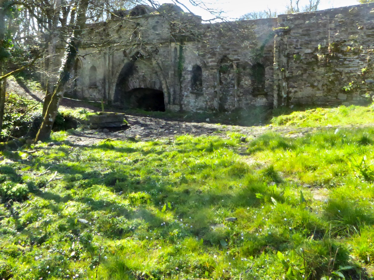 Although the grand houses at the centre of the estate have now gone (see this photograph in the National Library for a glimpse of the last one), there is lots of evidence still of such a designed landscape. Originally lawns sloped to the river – no need to build artificial ponds as the Ilen provided the perfect watery scene. Little round towers were built to be used as gazebos or belvederes (and in one case a dovecote): three in all, of which the stump of one and a fairly complete second are still to be seen. The bridge with its elaborate facing was the crowning glory of the estate wall.