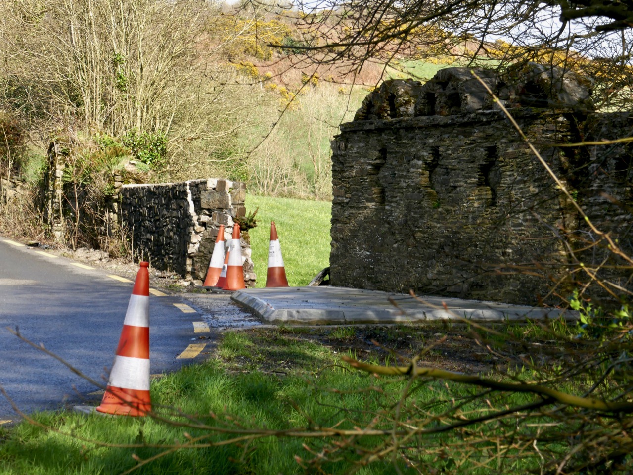Does anyone know how the damage happened? Did a car take the bend too fast and hit the wall? Did the concrete work loosen the structure of the wall? Let us know if you have information. I hope nobody was hurt. All I know is that one morning I was driving into Skibbereen and there was a chunk of the wall – gone! [EDIT: Apparently a young and inexperienced driver took the bend too fast and hit the wall. He was not badly hurt, thank goodness.]