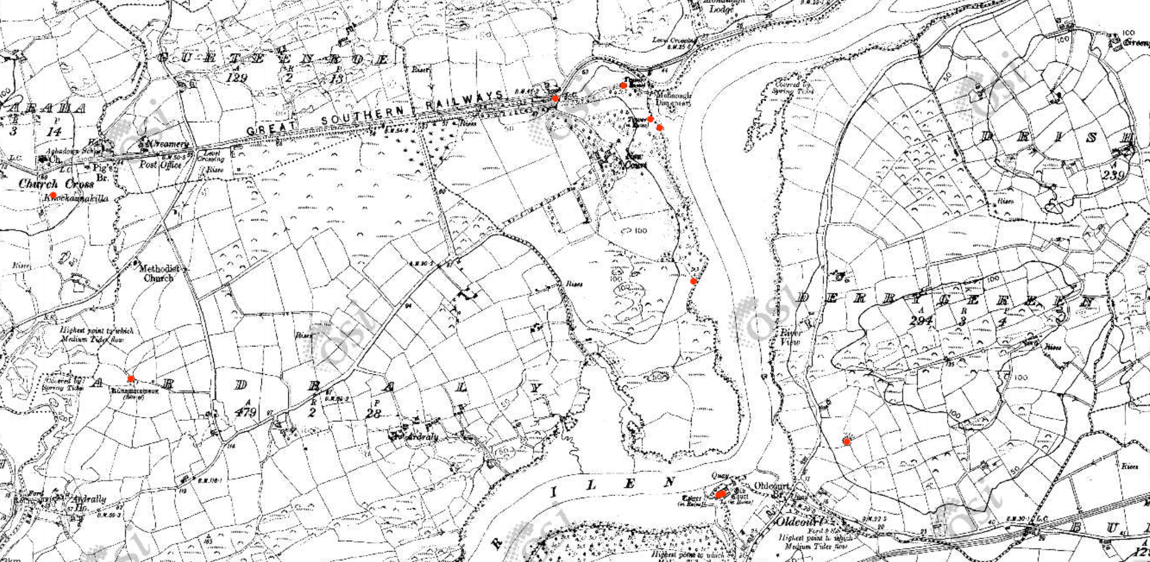 Early Ordnance Survey map of the New Court Estate, bounded by the Ilen River on the east and south. The red dots indicate the locations of the belvederes (marked as towers) and the bridge
