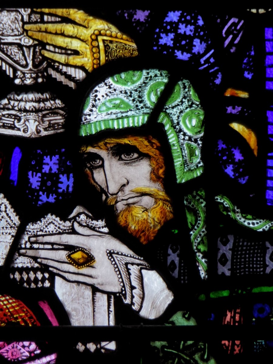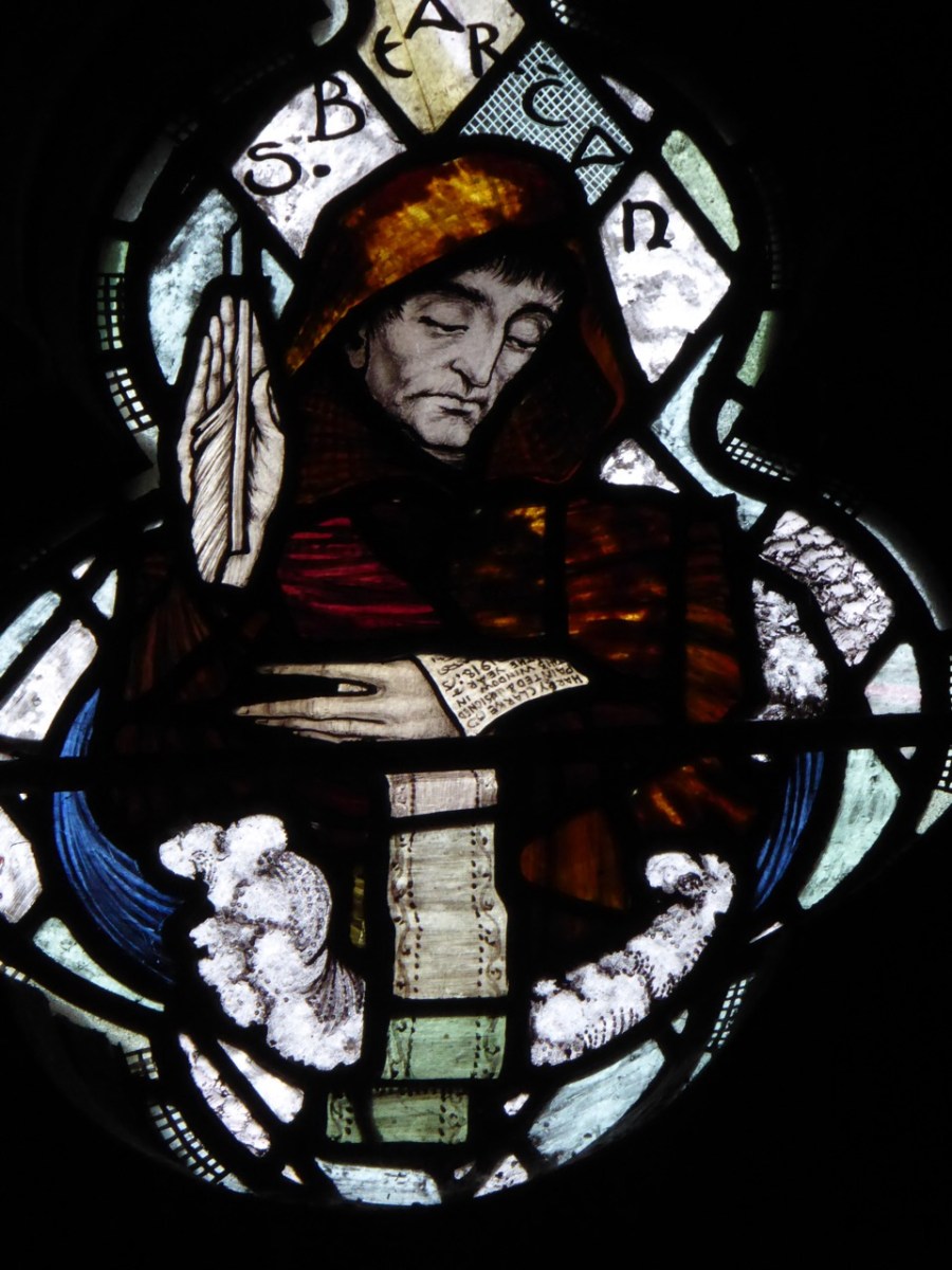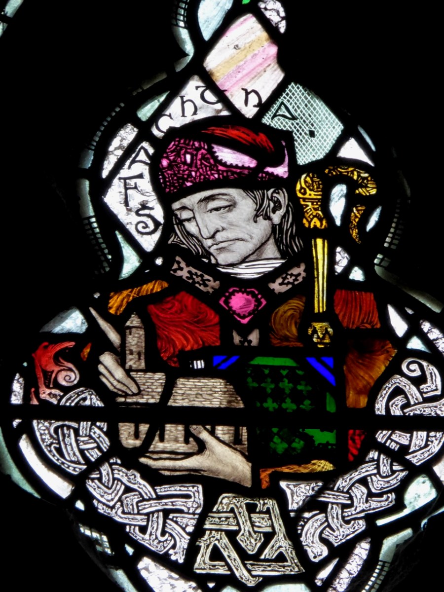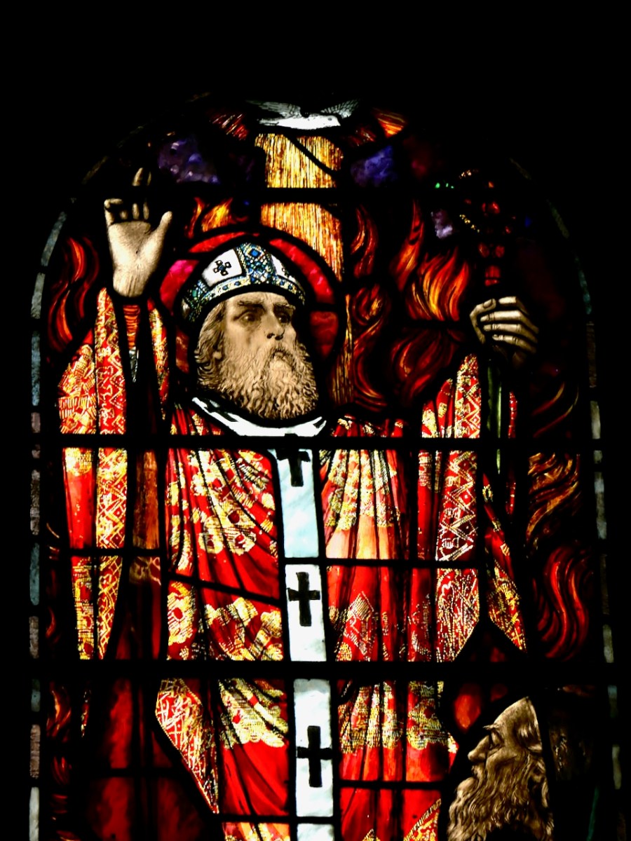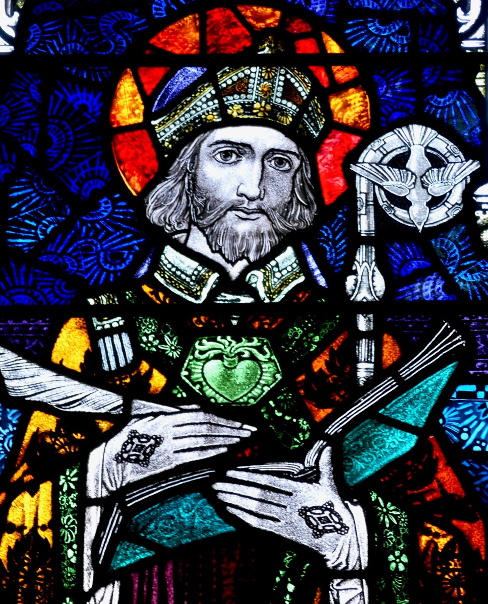 From a private bishop’s oratory, Sts Macartan, Brigid, Patrick and Dympna. Detail of Macartan, below. The rich reds and yellow shading of Macartan’s robes are the result of aciding and silver stain, described further down