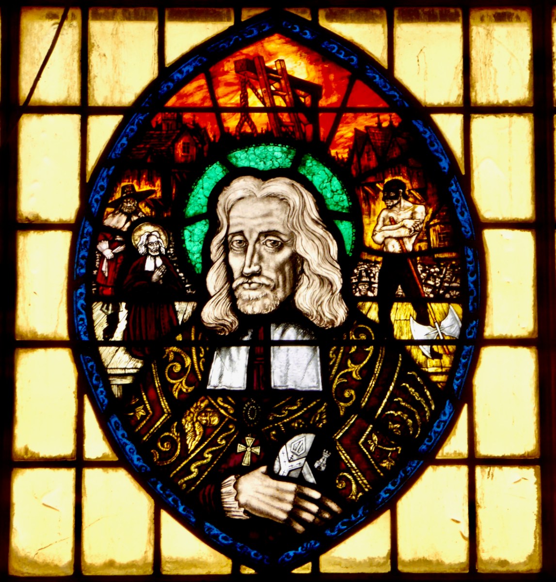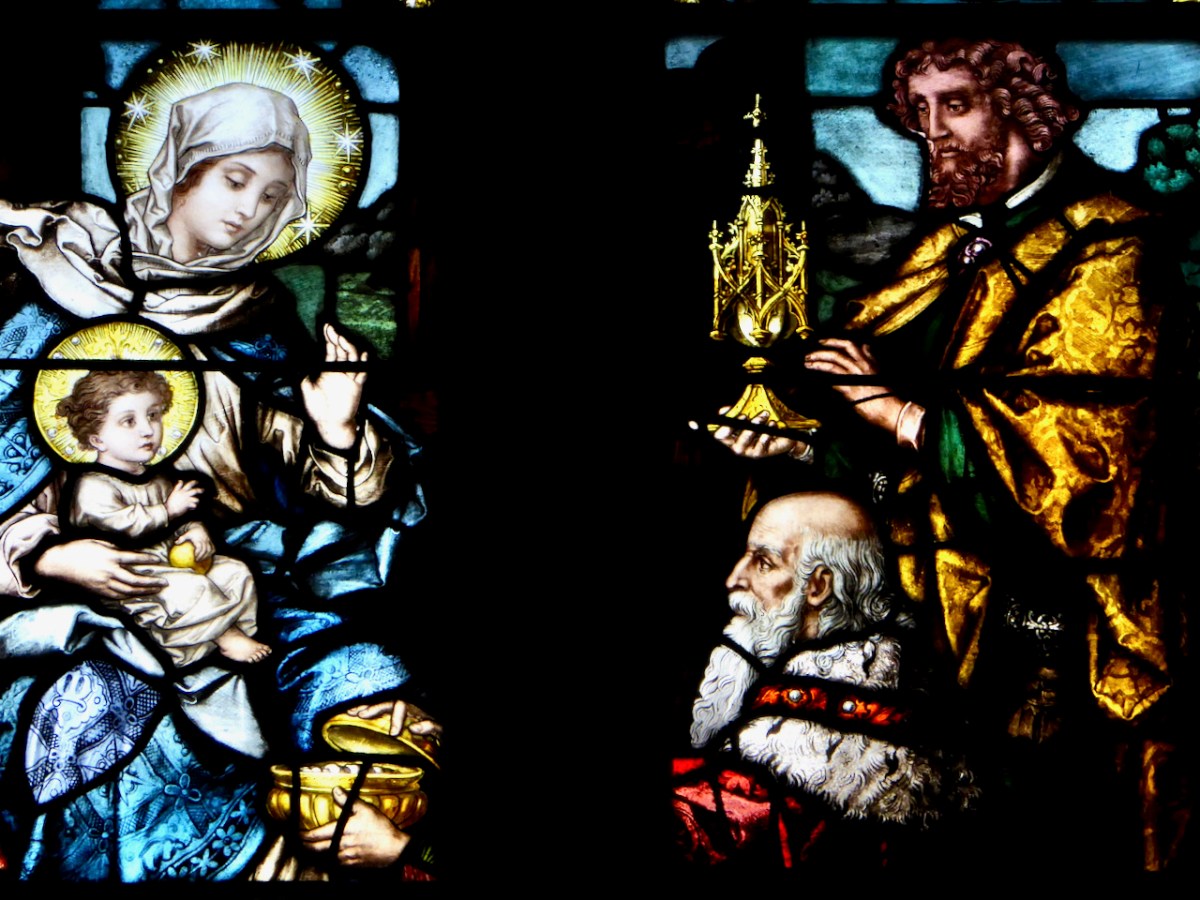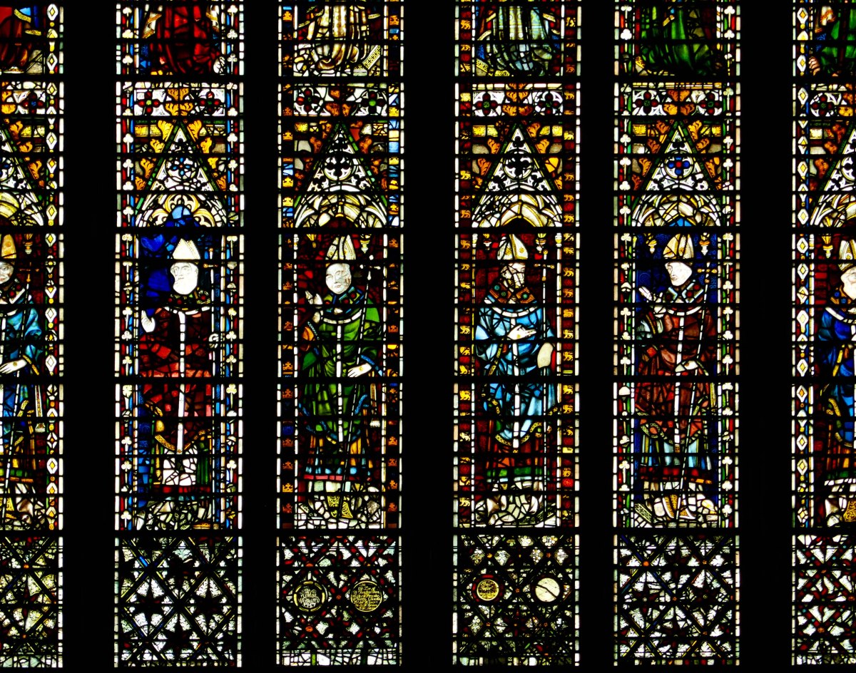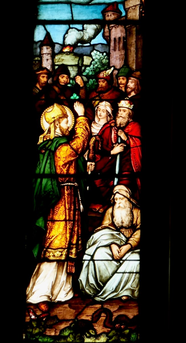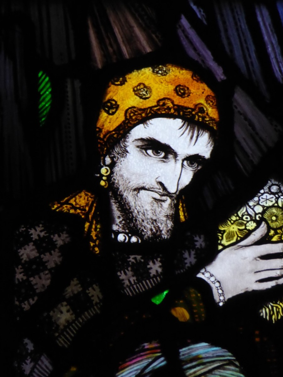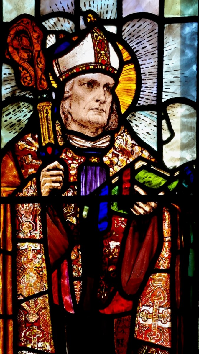 From a private bishop’s oratory, Sts Macartan, Brigid, Patrick and Dympna. Detail of Macartan, below. The rich reds and yellow shading of Macartan’s robes are the result of aciding and silver stain, described further down