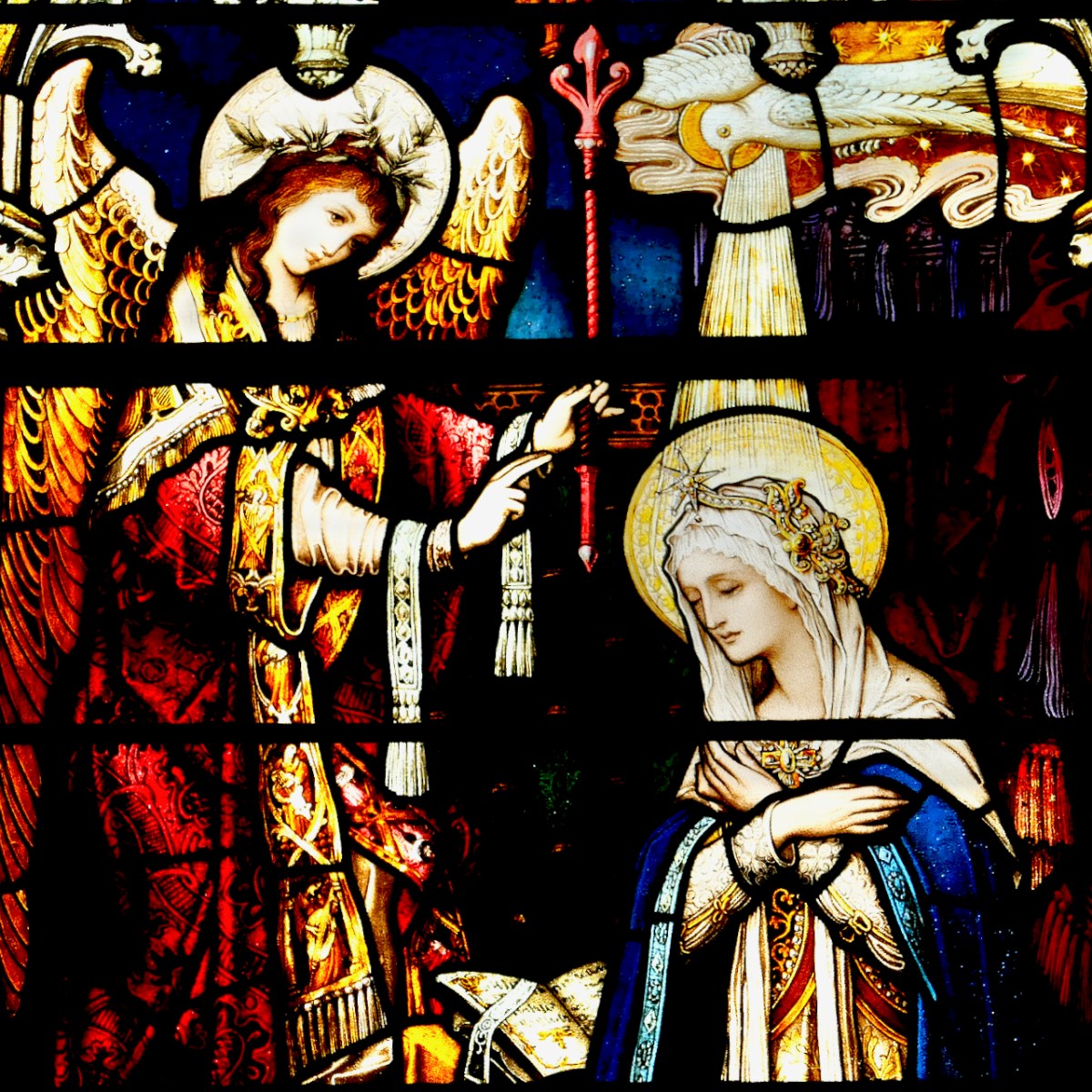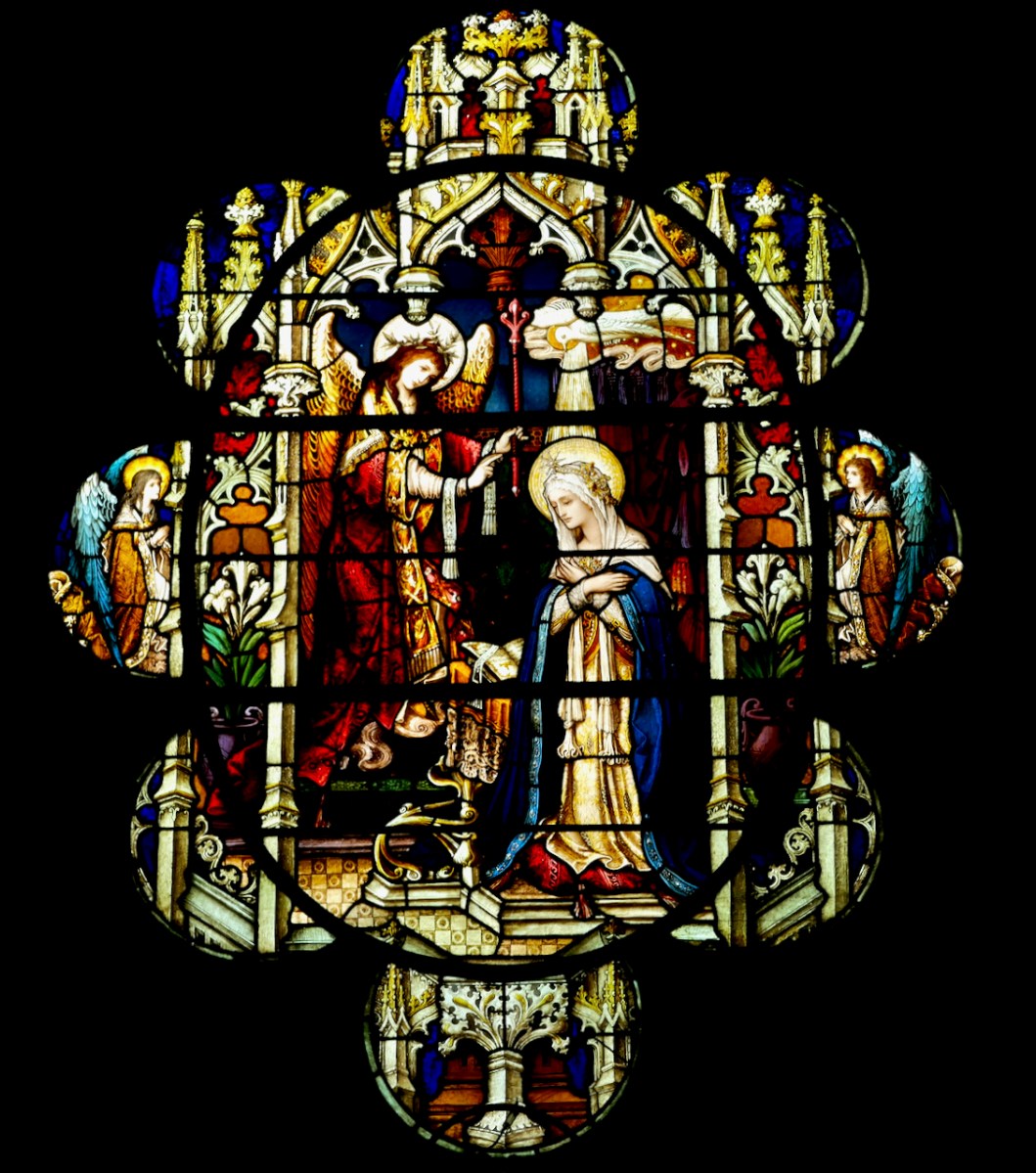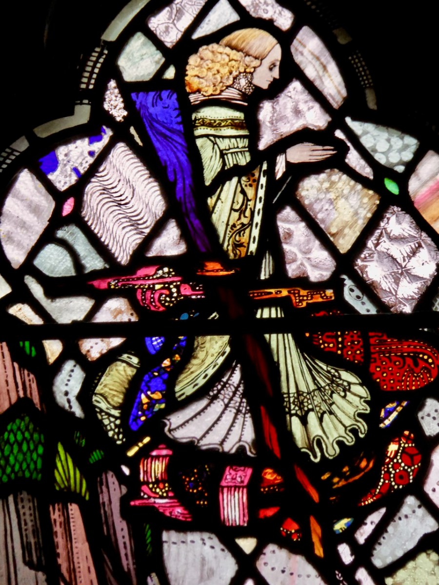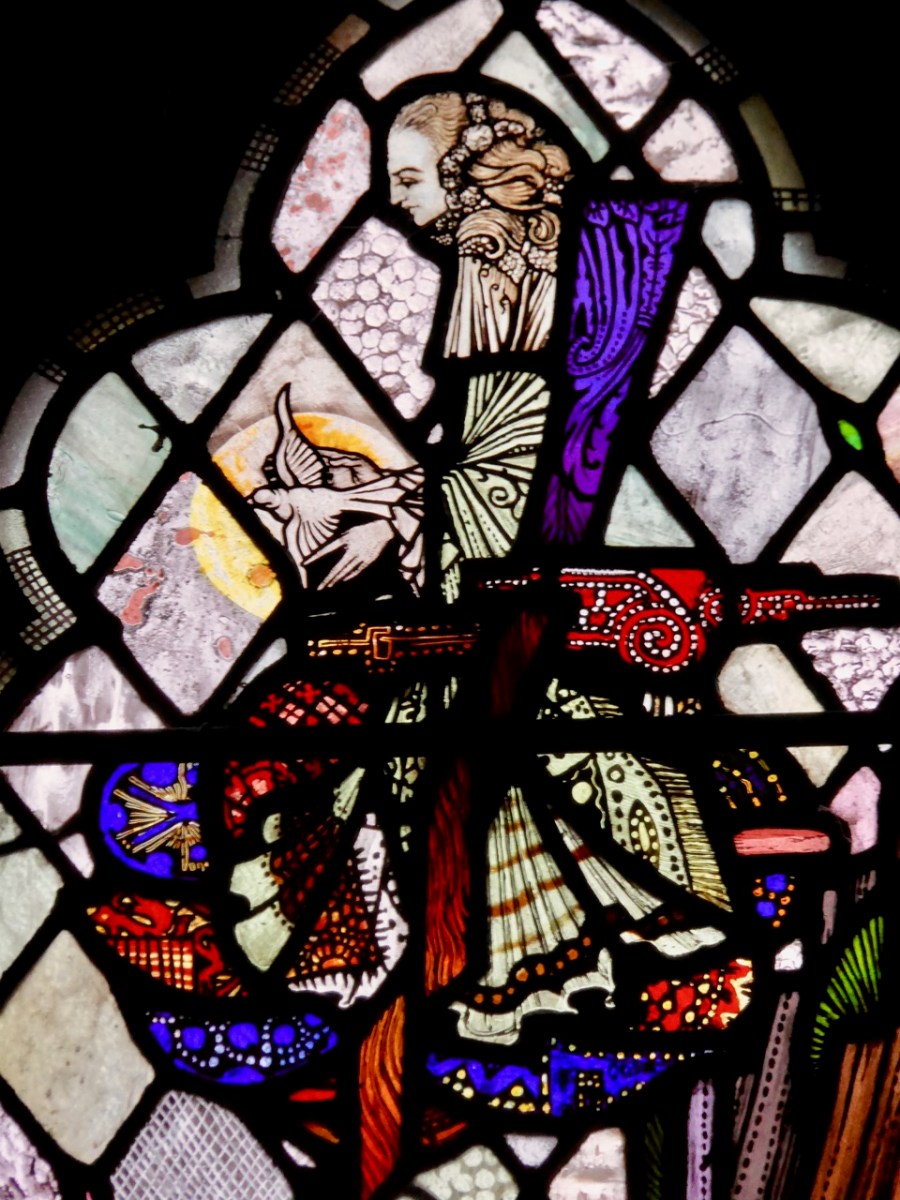 The Annunciation, Loughrea Cathedral. This window was closely based on a design by the great arts and crafts stained glass master, Christopher Whall. Whall came over from England to supervise the execution of it by the Túr Gloine artists, including Healy. Celtic revival interlacing was very popular at the time, and a way of putting a nationalistic stamp on a window – note the subtle inclusions of interlacing here and there