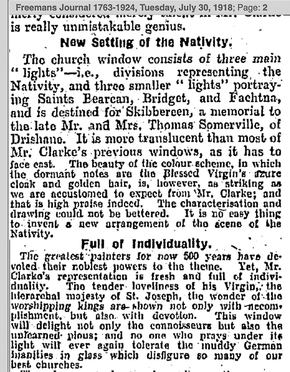 Along the way we meet a host of characters – the redoubtable Sarah Purser and his colleagues at An Túr Gloine, enterprising priests and bishops, citizens memorialising their dead family members (CS Lewis!), art critics such as C P Curran, American heiresses, patrons of the arts, Celtic Revival influencers (OK, modern word, but you know who I mean). We get insights into the inner workings of the studio, wherein frequent bouts of unprofessional behaviour created tensions, and where Sarah Purser often had to crack the whip when productivity lagged. We come to understand the difficulties of soliciting business, agreeing on final designs and delivering orders, especially to overseas clients, in days when postal service to American and New Zealand took weeks.