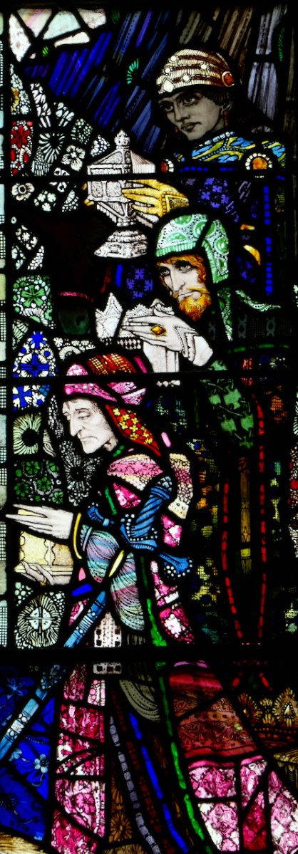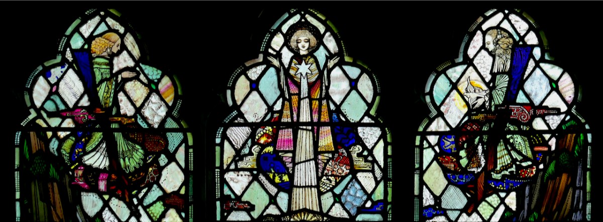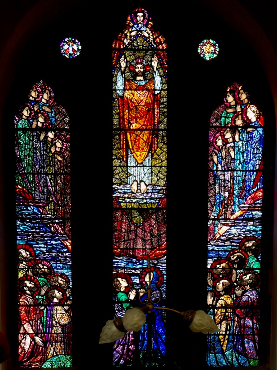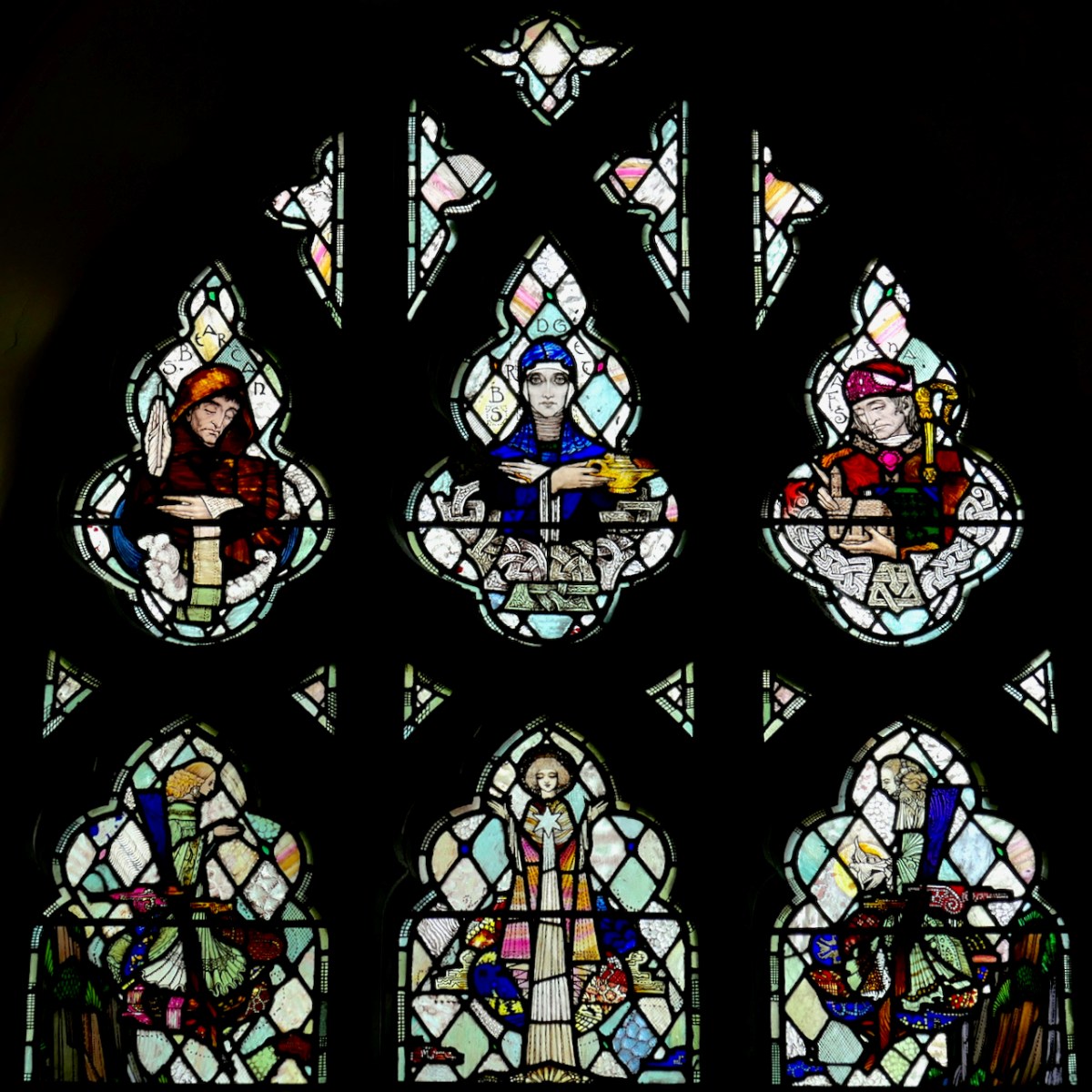 All the photographs in this post are my own – but I haven’t seen that many Healy windows, and my photography does not bear comparison with Jozef’s magnificent images. The book is profusely illustrated – it’s one of its many strengths – with many photographs of the tiny details in which Healy delighted and which distinguish his windows from those of other artists. Healy spent all his working life at An Túr Gloine (The Tower of Glass) the Studio founded by Sarah Purser. If you are unfamiliar with this period in Irish stained glass, you might like to read my post Loughrea Cathedral and the Irish Arts and Crafts Movement before continuing.