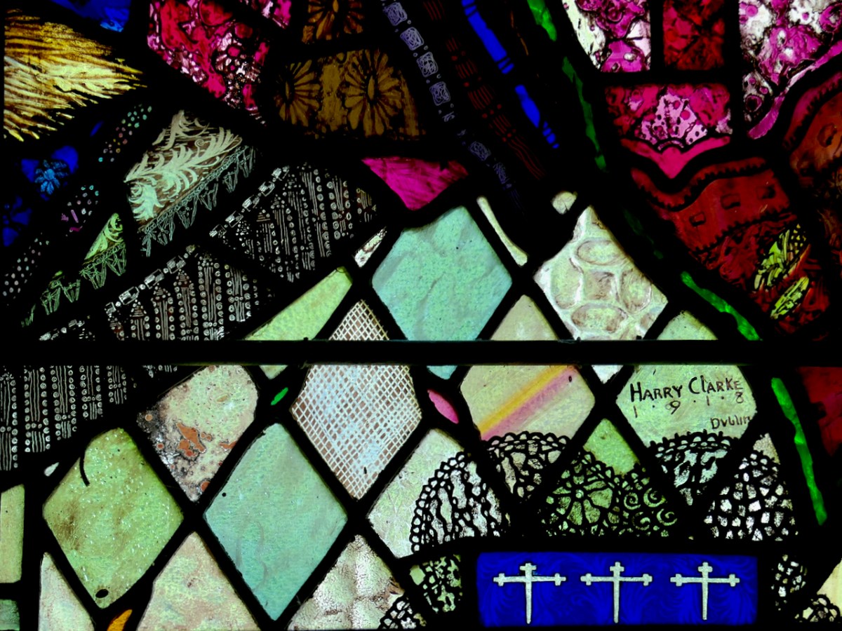 Long before Harry Clarke made it is his signature, Healy was a master of aciding, a difficult (and dangerous) process used to remove colour from the surface of flashed glass. Flashed glass is clear glass which has a skim of coloured glass fired onto its surface. This top layer could be removed by scratching or etching it away, or by immersing the glass in a bath of hydrofluoric acid, having first applied beeswax to any surface where the colour should remain intact. By waxing and immersing, often several times, colour could be altered from, for example, a rich ruby red to the merest hint of pink, and all shades in between.