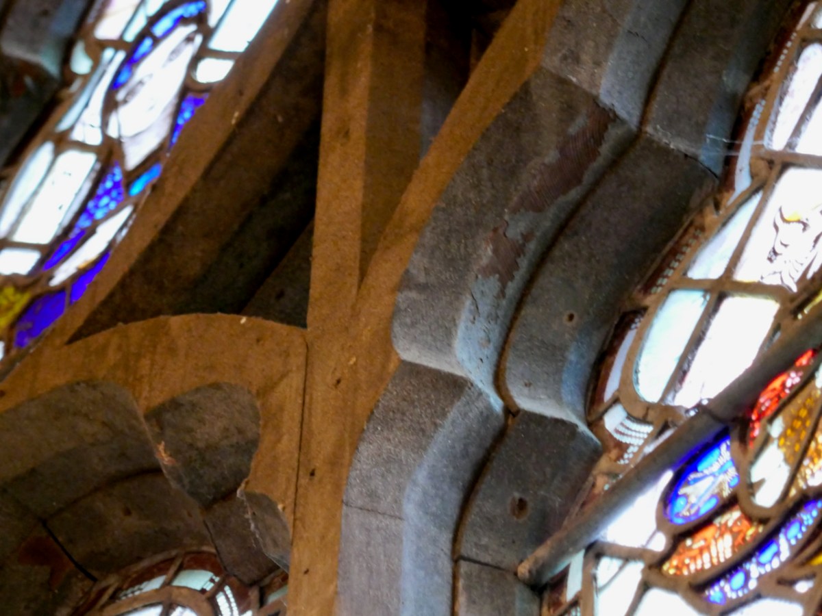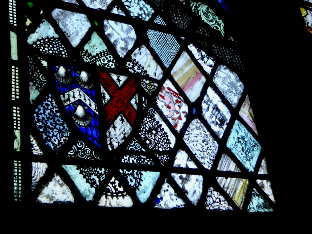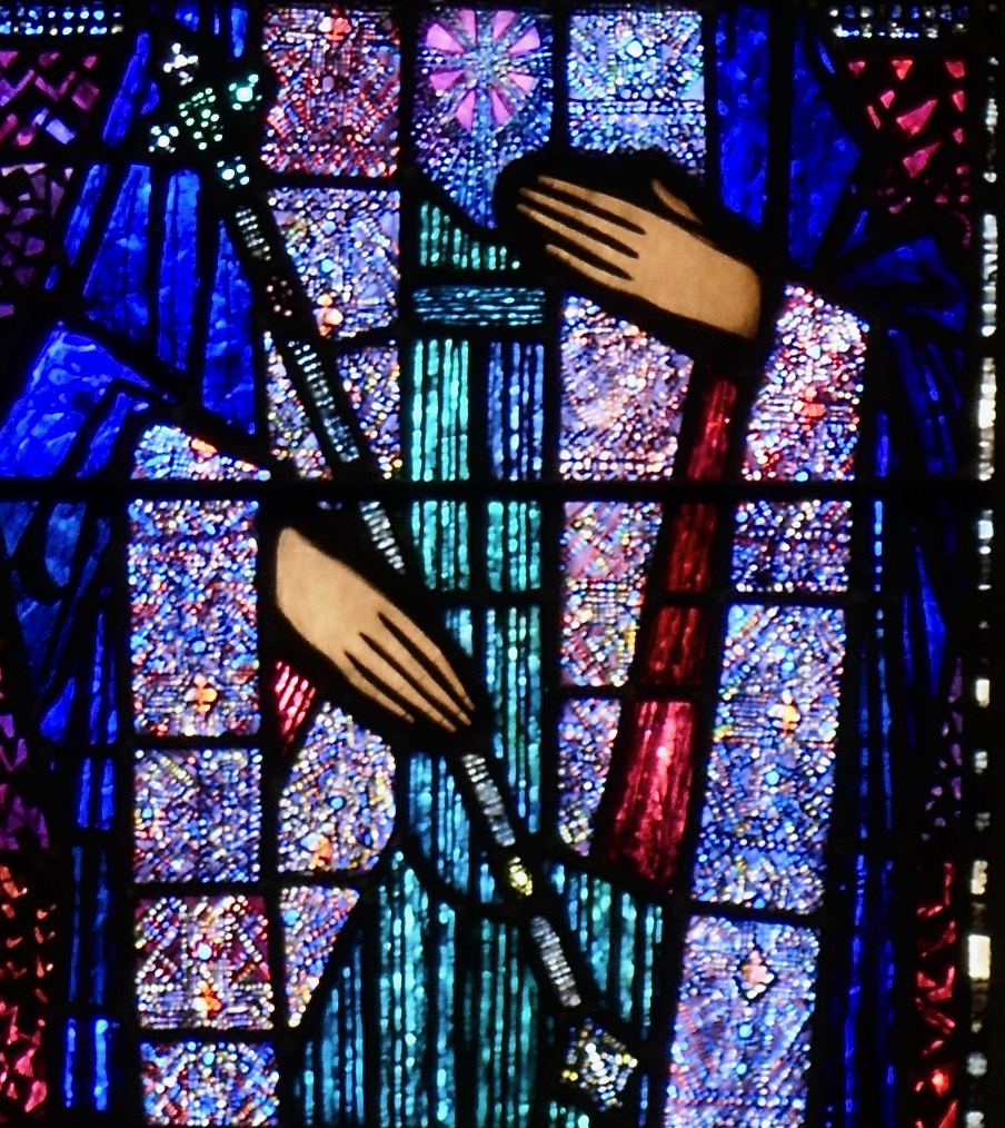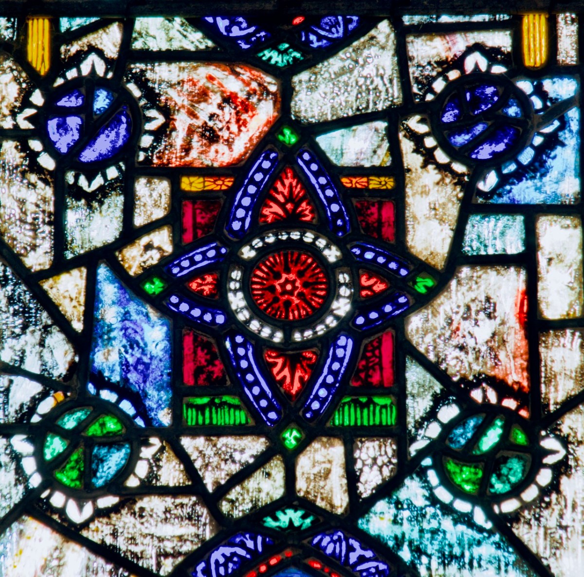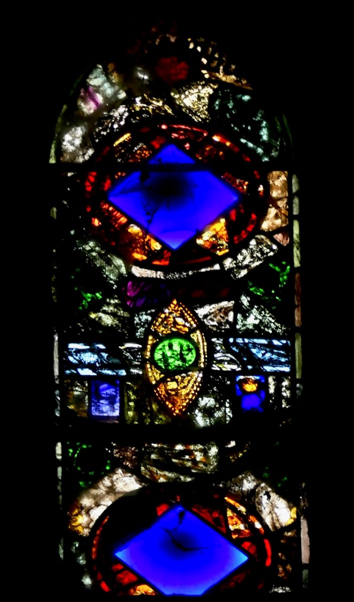 This detail from Healy’s Virgin Mary window in Loughrea illustrates well his aciding technique using red and blue flashed glass plated together to produce not only infinite shades of colour but a sparkling jewel-like effect