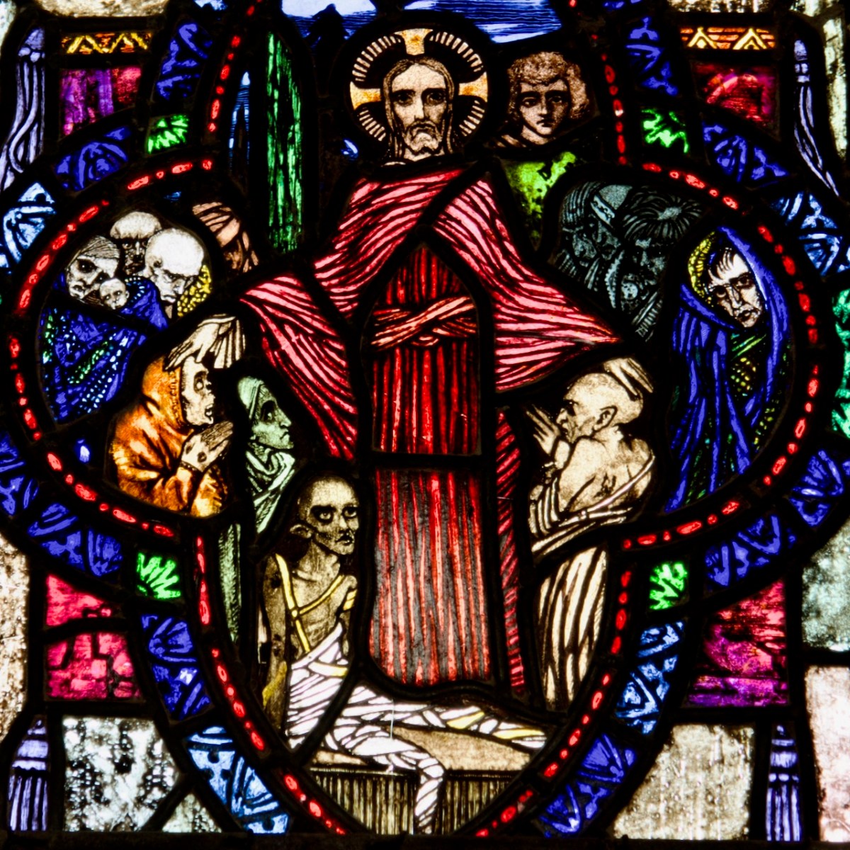 Healy would often plate two sheets of glass together – for example, one red and the other blue – each one carefully acided, and could by this means achieve an astonishing array of colours from the red-blue side of the spectrum. Added to this, he would often use silver stain on the back of the glass. Once heated in the kiln, the silver stain would permeate the glass, turning it yellow (repeated firings could deepen this from bright yellow to a rich amber colour). Finally, all the figuration would be painted and stippled on to the surface of the glass and the individual pieces of glass would be assembled and leaded together to produce the finished window. Healy was a perfectionist and Purser would despair of ever making enough money to keep the studio going since he spent so long on each commission.