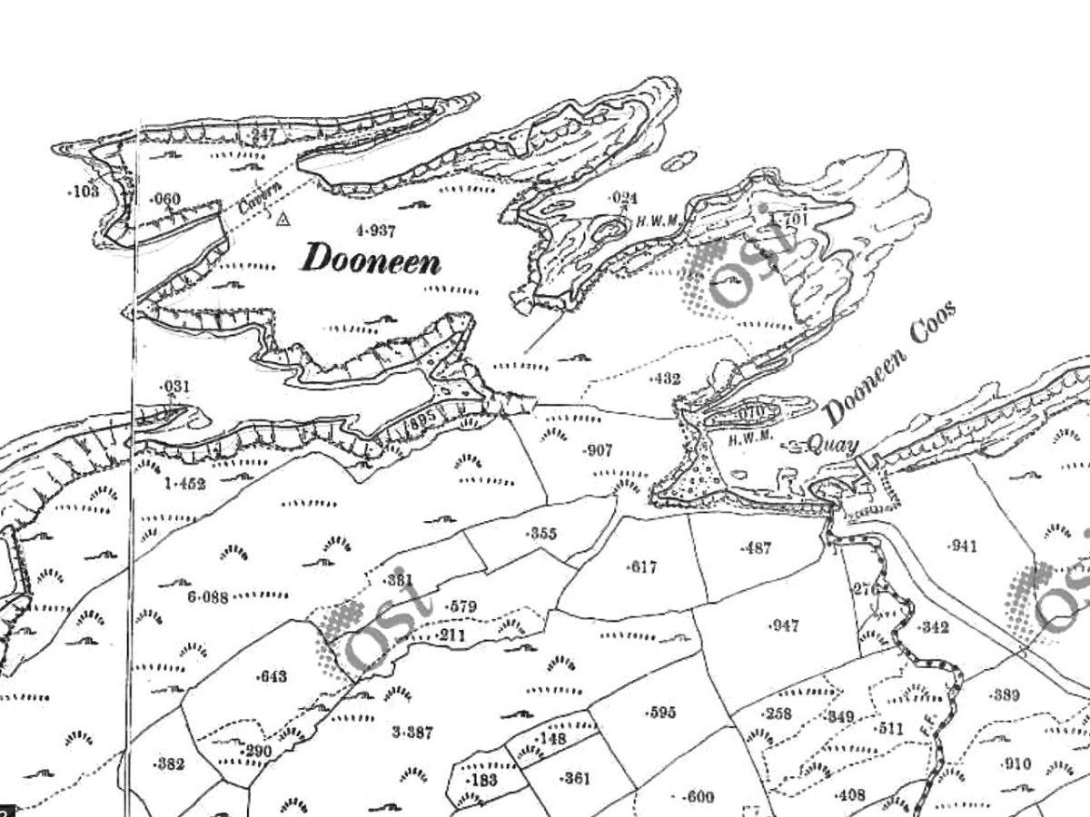 The peninsula we explored, with good friends Con and Una, was traditionally known as the Meallán (pronounced mal – awn, meaning a small knoll). It is also labelled Dooneen (Little Fort) on the historic 25inch map, and the harbour Dooneen Coos. This is rendered as Doonleen on the Historic 6inch map, which looks like it might be a misprint, since there isn’t a sensible translation. Northside doesn’t use either of those names.