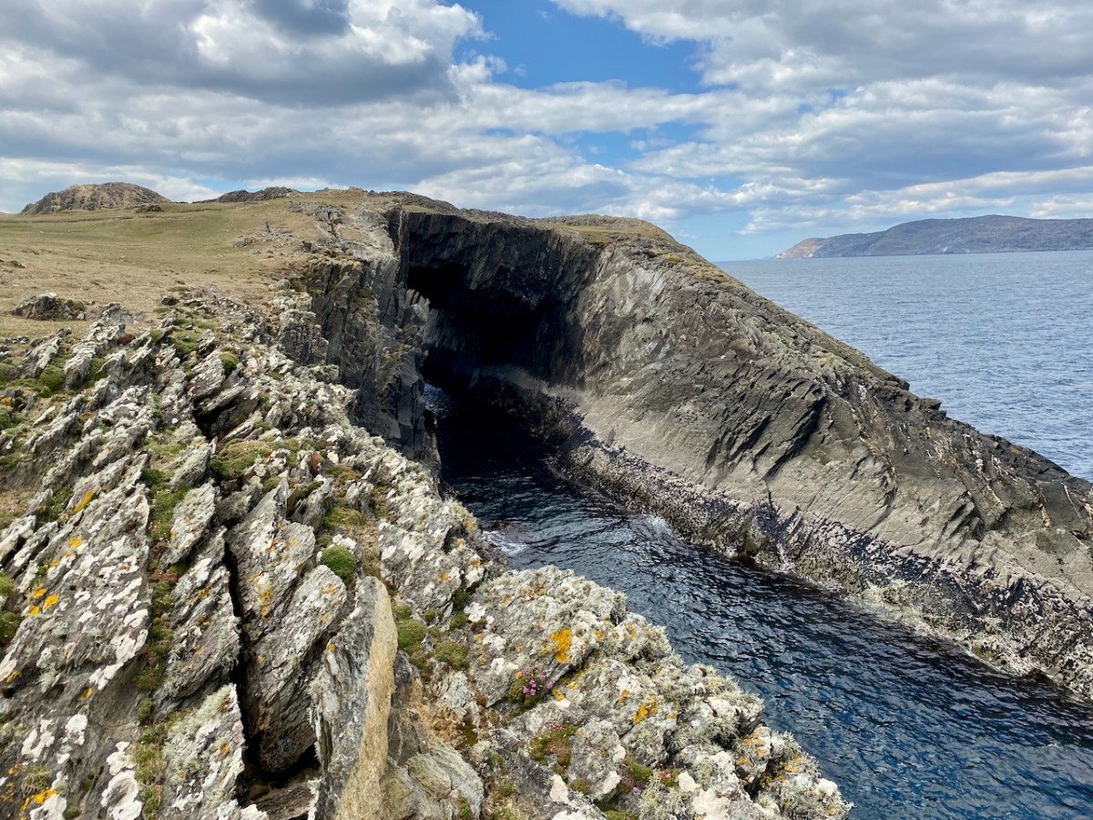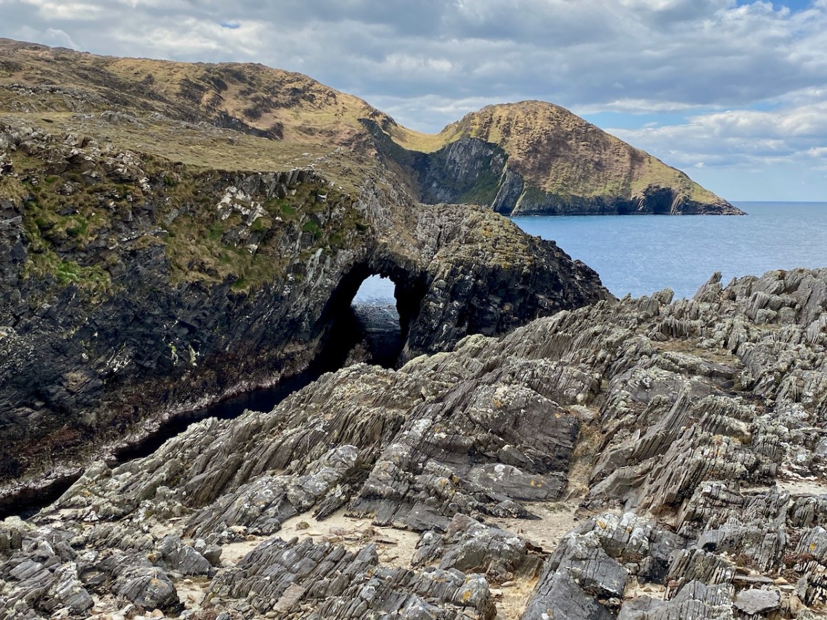There’s a small sea arch of more recent vintage on the east end of The Meallán, near the lazy beds – you can see the land has collapsed relatively recently. And yet a third on the mainland just west of the Meallán – equally as spectacular as the one we crossed over (above, and the lead photograph). From all points there are amazing views up and down Dunmanus Bay and across to the Sheeps Head.