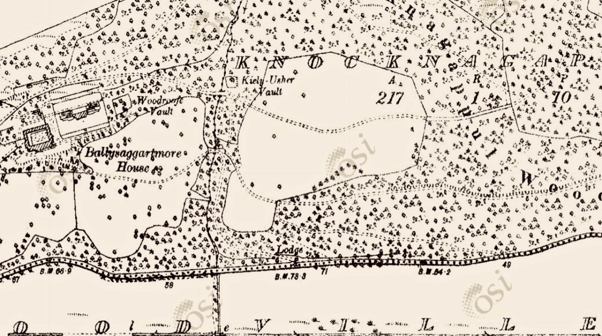 These extracts from the c1840 first edition 6″ Ordnance Survey maps show parts of the Ballysaggartmore Demense. In the upper plan, a house can be seen, probably newly built at the time of the survey. Nothing remains of it now, but some photographs exist, dating from 1904.