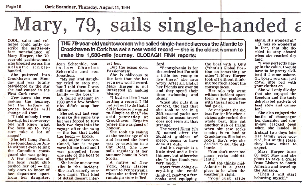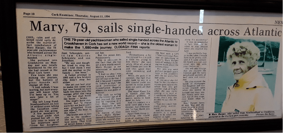 I then came across Roaringwater Journal written every week by Finola Finlay and Robert Harris. Since Roaringwater Bay is one of the nearest landfalls for Trans-Atlantic sailors I felt they should know about Mary Harper. They did not, but set in motion an enquiry (special thanks to Florence Newman for this lead) which eventually took me to the iconic O’Sullivan’s Bar in Crookhaven run by Dermot and Linda O’Sullivan. Linda e-mailed me a framed press cutting which hung on the wall of the pub with all the other nautical memorabilia. The cutting was from the Cork Examiner of 11th August 1994 and was an interview with Mary Harper, aged 79, who landed in Crookhaven on 8th August on her 30ft sloop, Kuan Yin II, named after the Buddhist Goddess of Mercy and patroness of sailors and seafarers. Bingo! I now had evidence of Mary’s crossing.