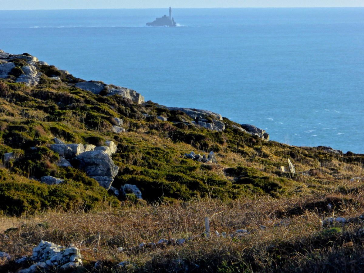The final one was harder to find and necessitated negotiations of some seriously muddy fields. Tobairín Brón (Little Well of Brone) was in the general vicinity of where we ended up, along with a small monastic site – all very brambly and hard to decipher. But what a place – a view clear out to the Fastnet Rock, with Knockaphuca looming behind us. Cnoc an Phúca means the Hill of the Mischievous Spirit – it’s been tamed, presumably, by the large cross erected on its peak.