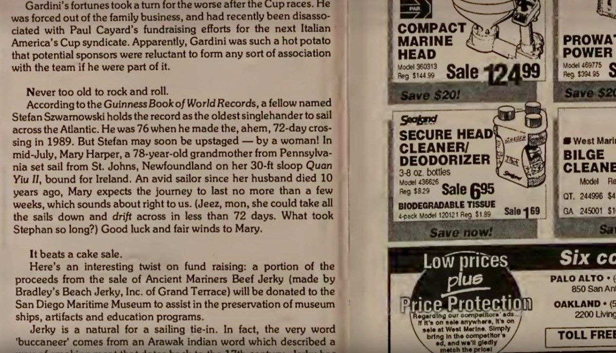 Our conversation was interrupted by an almighty wave which shook the ship so I went below to check on Valerie, my wife, in our cabin, to find her injured. I was not able to speak to Mary Harper again as we landed the next day, but resolved to research her voyage to Ireland when I got back to my home in the UK. Strangely, I could find nothing out about her exploits on the Internet. Eventually I tackled the search by looking for her as a person who sailed out of Nova Scotia and there I was in luck as it had been reported that Mary Harper had set out to cross the Atlantic but had to be rescued as she sustained fractured ribs in a storm; but that was in 1993 and she told me it was in 1994. Turns out she did try in 1993, but had to abandon the trip: Latitude Magazine recorded her intentions (below)