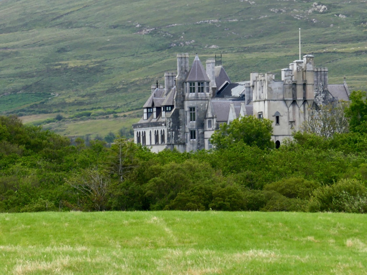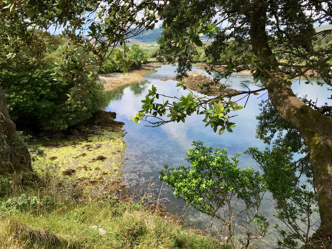 The path runs up a very slight ledge, flaking away and high above the creek, along the face of a cliff of polished silvery slate. The low neck joined it to the mainland, and the nearly perpendicular strata make the dock-like creek of Coosadoona, fort-cove, to the south Beside this cove, opposite to the castle, an enormous precipice rises high above the tower top. In the other direction is a noble view across the wide, porpoise-haunted bay, and its low islands to the blue, many-channelled Mount Gabriel, and on to Mizen Head.