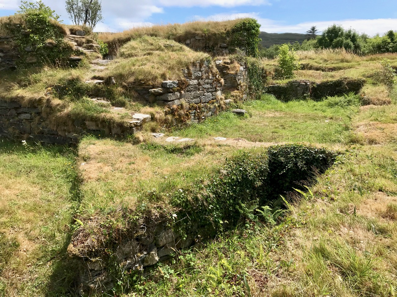 Description: In rough pasture, at the foot of a steep N-facing slope on Stuckaunfoilnabena, a headland on the NW coast of Clear Island. A narrow eroding neck of land (Wth 3m; L 15m) leads to the roughly anvil-shaped headland. Across this neck of land are the remains of three earthen banks and the shallow remains of three fosses. Further examination of the remains was not possible for safety reasons.