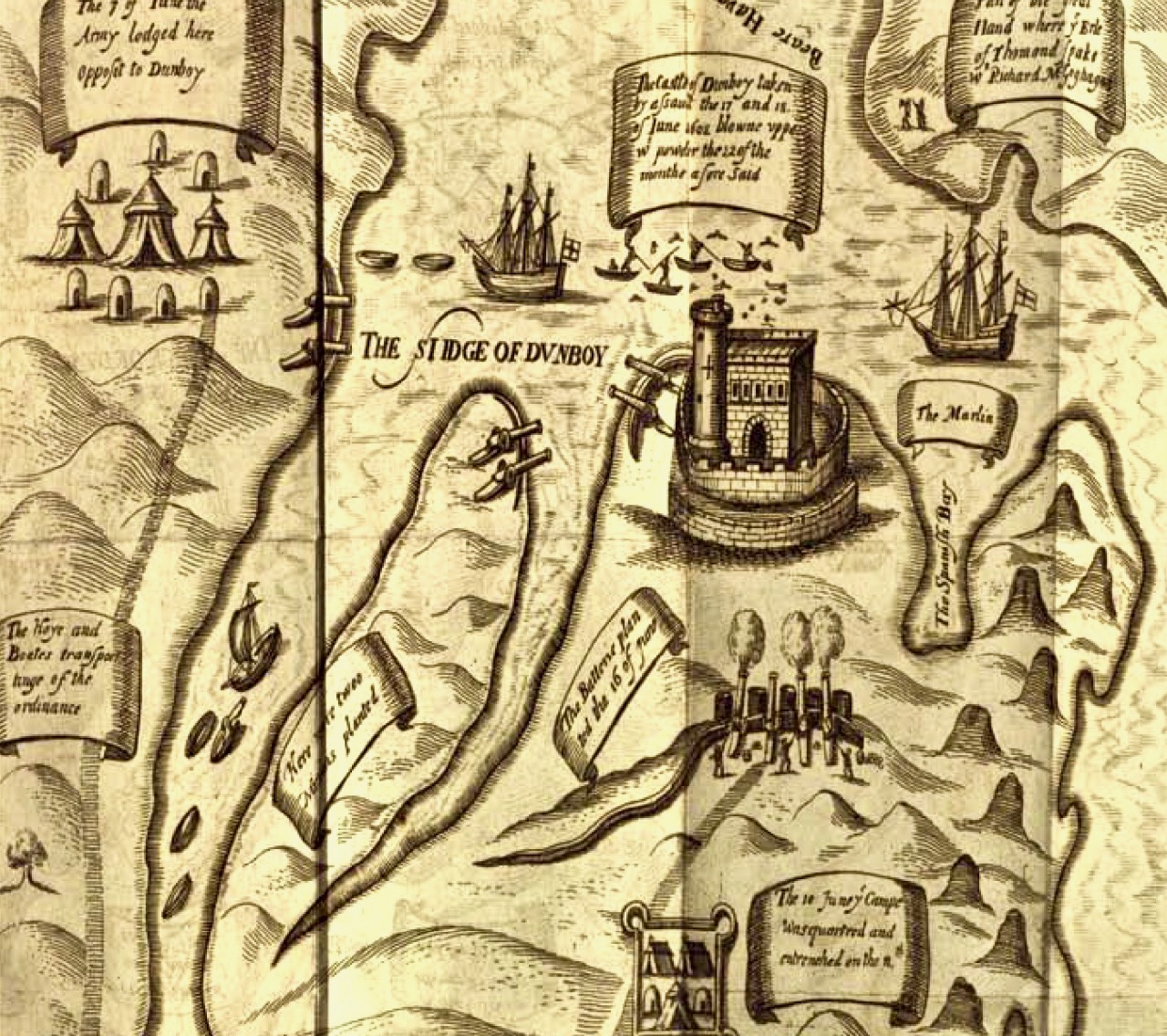 This illustration, from Pacata Hibernia, is of the siege of Dunboy Castle, the stronghold of O’Sullivan Beare, on Beara Peninsula. The destruction of Dún an Óir is described by James Burke in his article Cape Clear Island in the Journal of the Cork Historical and Archaeological Society Journal of 1908. Rather than Harvey simply taking over the castle, Burke relates the following: