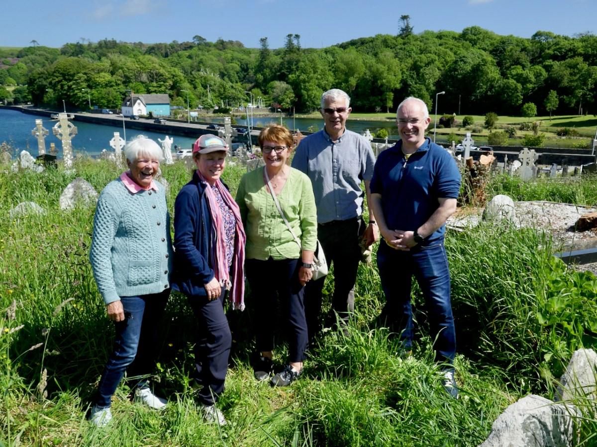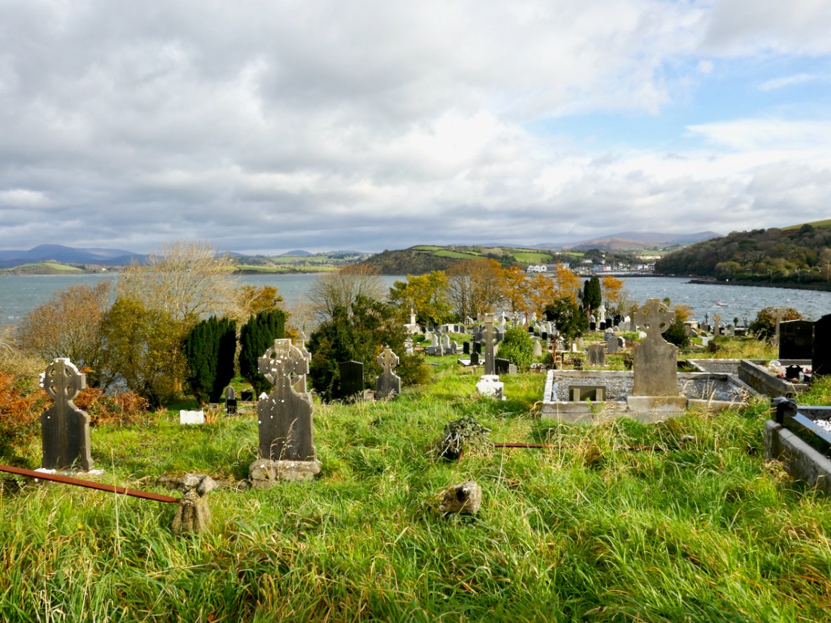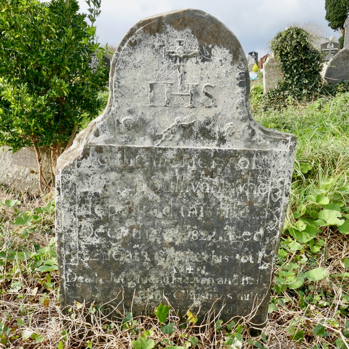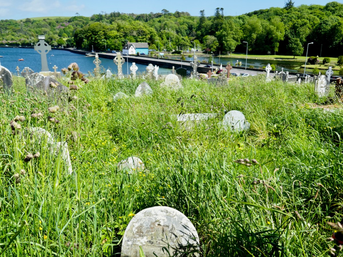 Here’s a vista to the north-east, from the top of the mound beside the graveyard that might just be a ring-fort, or possibly the site of a monastic centre dating from medieval times – more on that later. In the middle distance is the Ilen River with its wooded banks, heading out towards Castle Donovan and – eventually – to its source on Mullaghmesha (or, perhaps, Nowen Hill – we have yet to determine exactly where it rises. This post from the Sweet Ilen series covers the area). And that Donovan castle itself graces the cover of the latest Skibbereen Historical Journal (Volume 18, 2022), which you can get in bookshops locally, or online here. You will find a summary of some of my research on the Ilen River in this journal, together with many other fascinating and erudite articles.