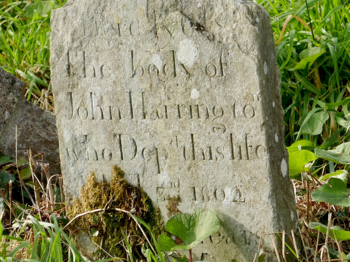 Above – the western boundary wall of Caheragh Old Graveyard. The small road continues over the Ilen River: the bridge here was built by the Congested Districts Board for Ireland in the early years of the twentieth century, to replace a ford, the stone flag bed of which can still be seen.