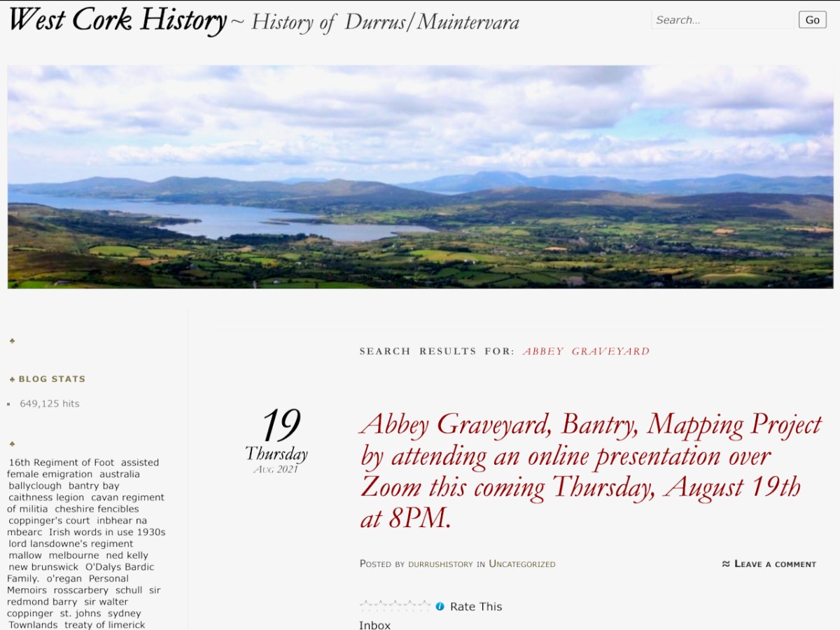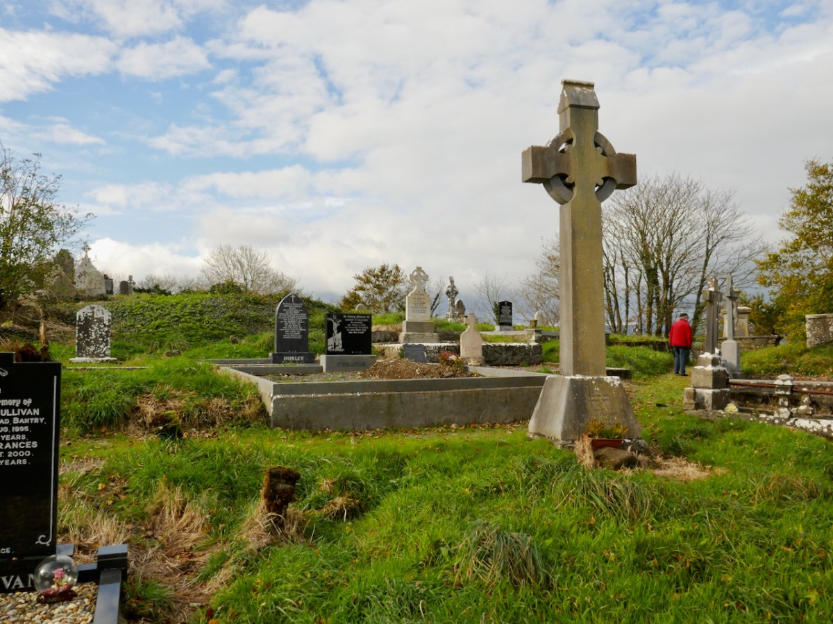So there – for your consideration – is the suggestion that the hill above Caheragh’s Old Graveyard (which may, in earlier times, have been a ringfort with a souterrain) was the monastic settlement Blessed Mary de Caheragh in medieval times. That’s quite a thought. My own opinion would be that the monastery would have been founded on the level ground close to the river: in fact where the graveyard is today. As the monastery declined, a church might have remained, eventually becoming a ruin. It was common for old churches and their environs to be used for burials and this might account for the comparative remoteness of this site from the village itself. Now – of course – there is no trace of a church ruin. This theory would hold good except for the annals quoted above, which state that a monastic site was situated on the hilltop overlooking what is now the graveyard.