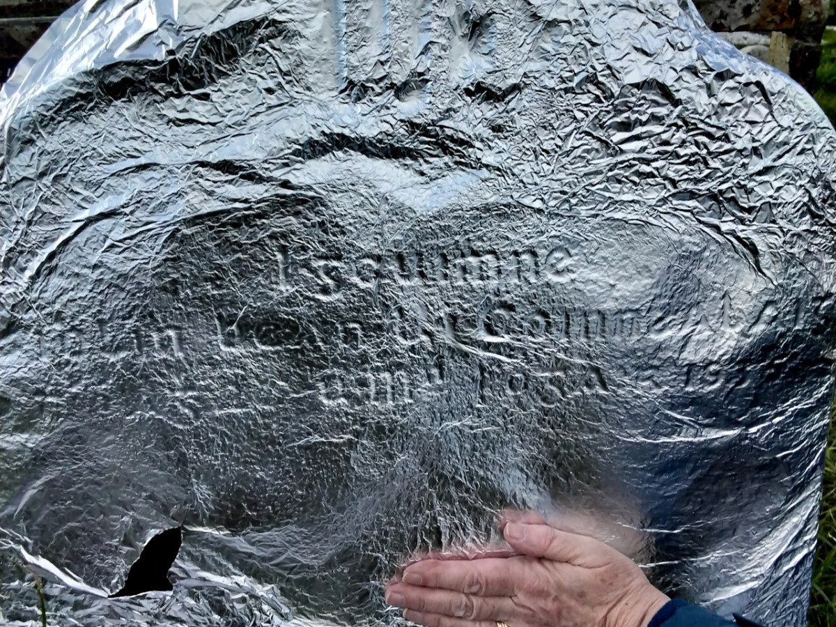 Evidence of stone quarries on the hillside suggest that significant quantities of stone has been used locally. Graveyard wall, field fences, or built structures? But the most challenging feature has to be the ringed foundation, or base, clear to see on the edge of the hill (below). Could it be a souterrain entrance – or, more fanciful, the base of a round tower?
