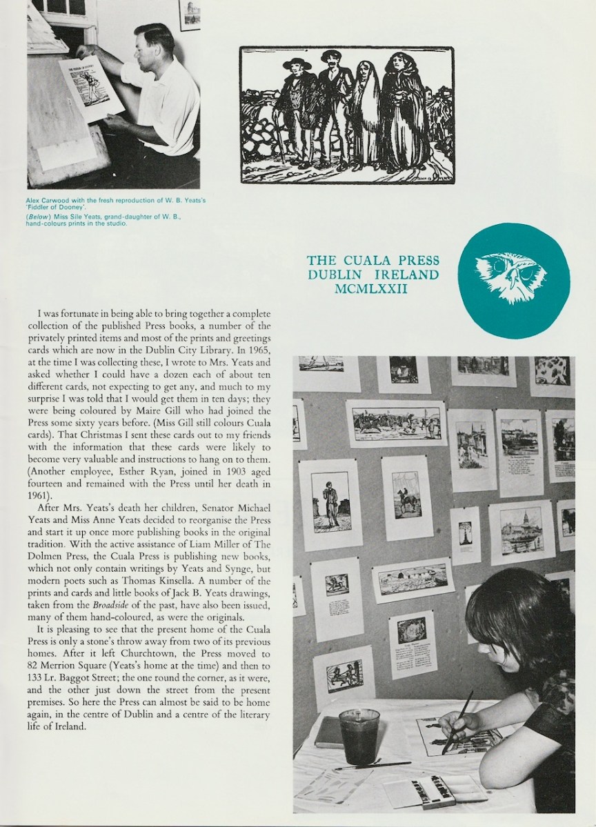My final choice, from November-December, is by Colin Smythe and tells the story of the Rebirth of the Cuala Press. Managed by Elizabeth Corbet Yeats, the Press published its first book in 1903, and from then until 1946 it produced beautiful hand-coloured books of poetry of stories in limited editions – works of art in themselves. After that time it continued with cards and prints.