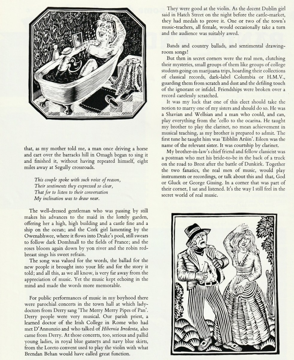 My third selection, from September-October, is a piece called Bands and Ballads by Benedict Kiely. From Co Tyrone, Kiely was one of the best known public intellectuals of my youth, frequently on radio and TV, or writing in the paper. Read his bio on the always-excellent Dictionary of Irish Biography site, written by Patrick Maume. This is a nostalgia piece for Kiely, here talking about his father: