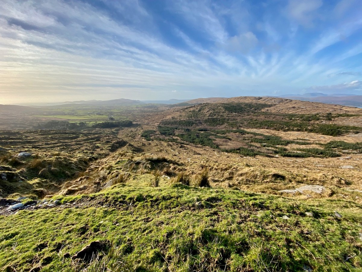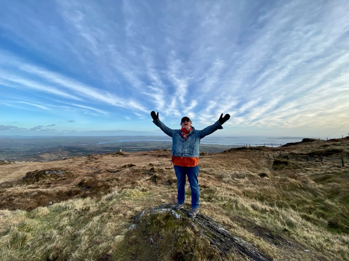 …And here is the view from the upper slopes of Mount Gabriel. Go up there on a good day and you are ensured the most scenic prospect from the top. During the year, Finola walked all the way up and – next – you can see her celebrating her achievement!