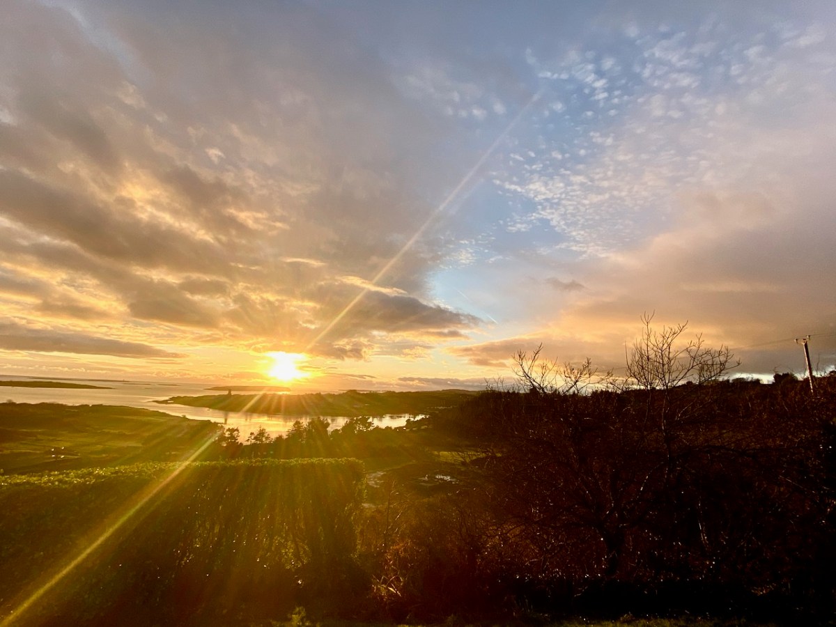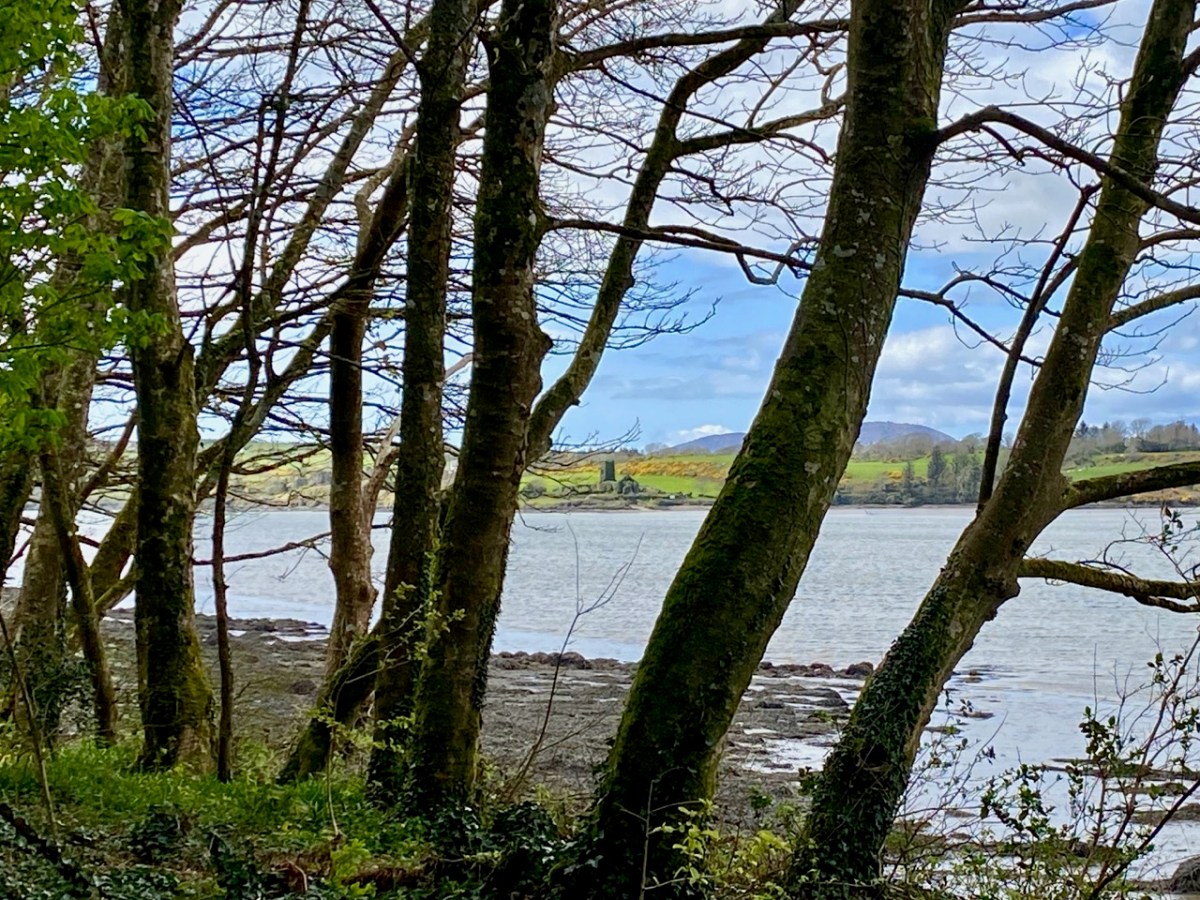 This view is from Inish Beg Estate, looking across the Ilen River towards the burial ground at Aughadown. In the background is Mount Gabriel