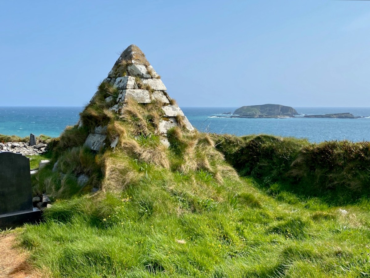 This pyramidical grave marker is one of a few in West Cork: it’s at Myross, and looks out over High Island and Low Island