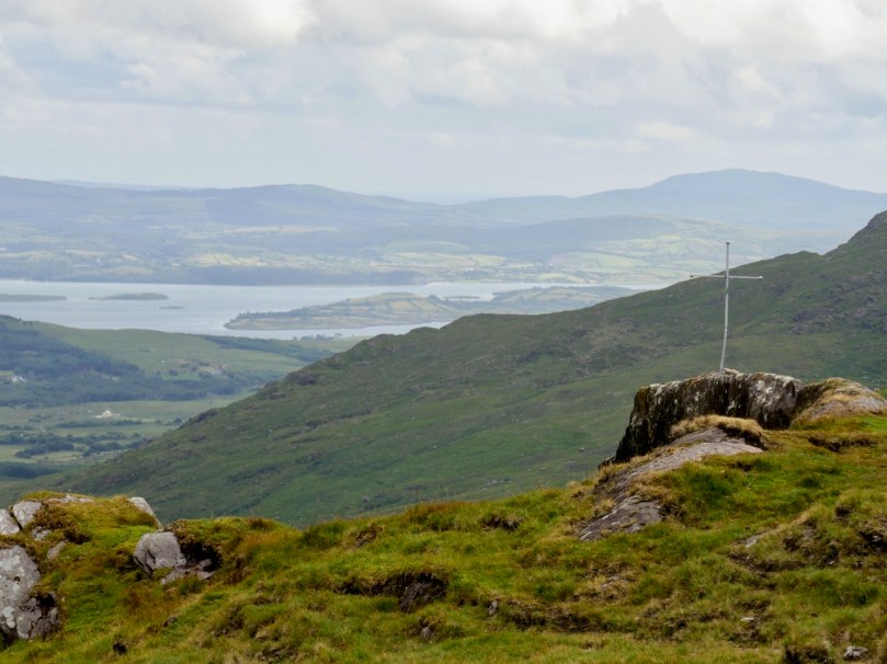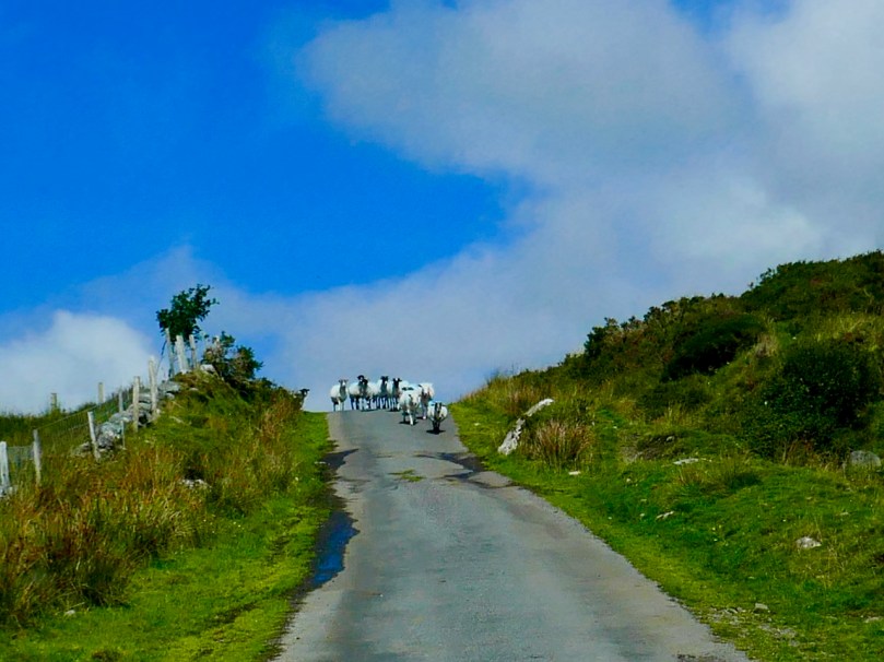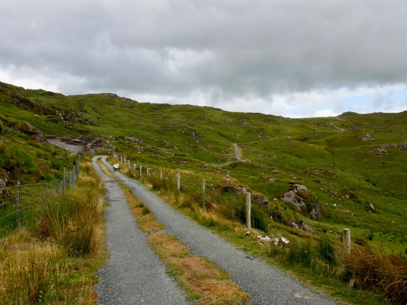 If you are not of a nervous disposition, and don’t mind travelling a narrow, single-track mountain road for some 15 kilometres, probably sharing it only with a few sheep, then to pass over this route is one of Ireland’s most spectacular experiences. Choose your day, though: we were lucky to have hot sun and clear views the whole way. If you survive it to the top, you are right on the Cork – Kerry border: in the photo below, the fence going on up the hill is exactly on that border line (and the point at which the priest and his horse took off is to the right of it at the peak). Stop and look around: the views in every direction are stunning.