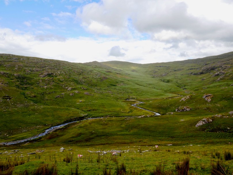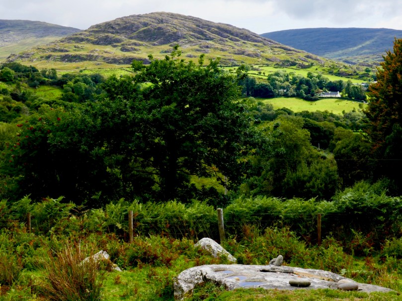 There is much more archaeology and history in this mountainous country: here (above) in the townland of Erneen, the view from the road across one of the many remote glens shows up former enclosures and ‘hut sites’, which the National Monuments Service describes thus: