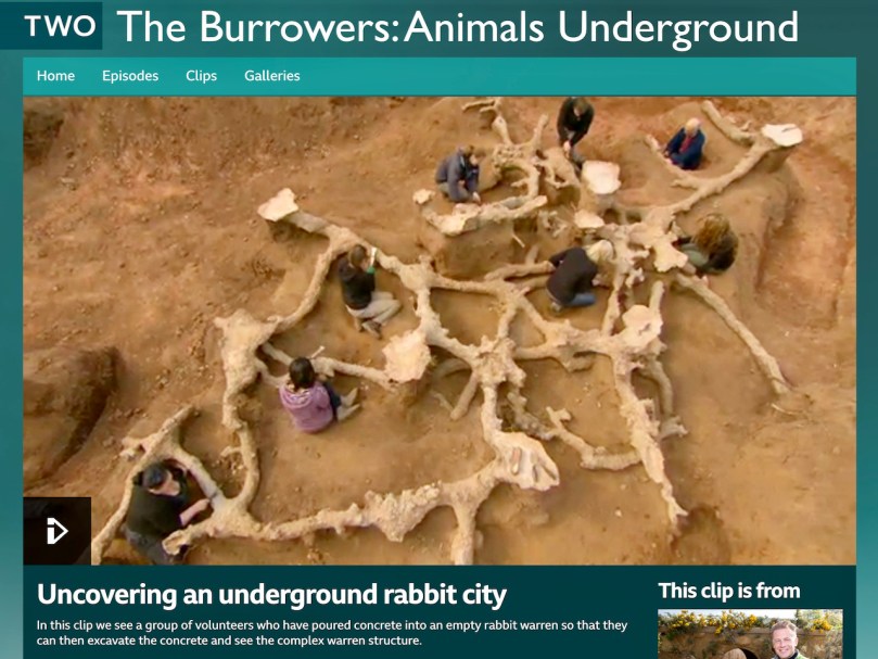 The warrens are obvious and sizeable – those big hind legs are effective digging machines! The tunnels have several entrances and contain passages and chambers where kittens can spend their first few days. Chris Packham, the British naturalist, has an amazing clip from his BBC program “The Burrowers” where a rabbit warren is filled with concrete, creating a model of its extent and complexity. Just click on the photo below and then on the picture again when you get to the site.