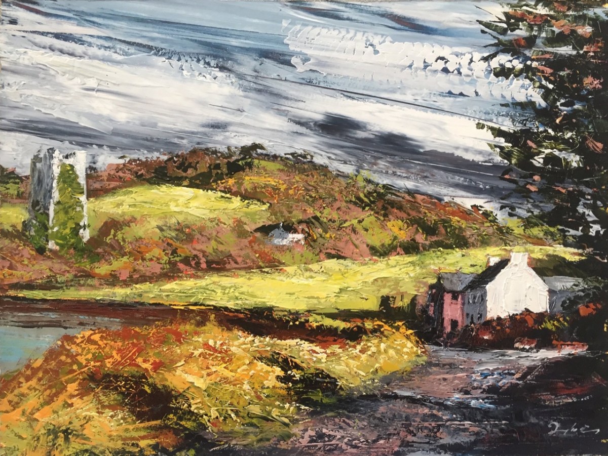 Here is a very fine painted view of Rathin Castle by contemporary West Cork artist Donagh Carey (thank you, Donagh!) You can find his works here: we are pleased to have some of them hanging at Nead at Iolair. I can’t resist including this photograph taken in the 1930s (below) – from the Adrian Healy postcard collection – showing Rathin, with the added bonus of a 1936 Ford 10 in the foreground!