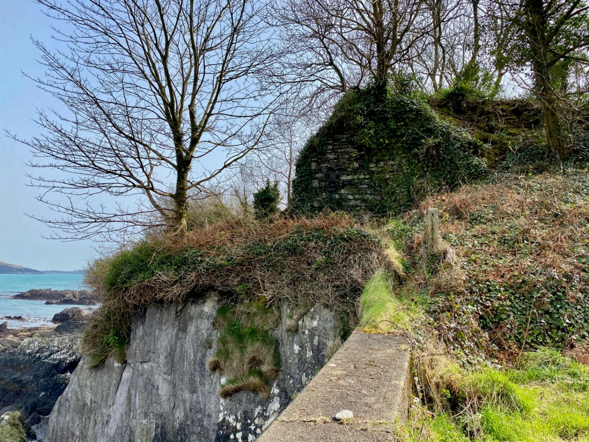 Upper – a view of the now-vanished tower of Glenbarrahane Castle at the entrance to the Haven by Cork antiquarian John Windele, 1801 – 1865 (courtesy National Library of Ireland) and lower – the vestigial stone walls that remain today beside the grey sands of Castlehaven