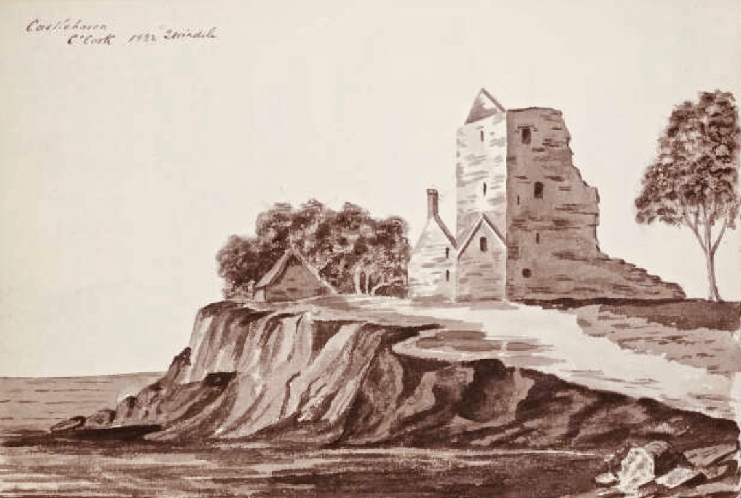 . . . A very early plate by Sir Joscelyn Coghill (c. 1865) showing the old Castlehaven church and above it the Castle in which the Reverend Robert Morrit lived, and before him the Reverend Thomas Somerville. The Tithe War had its effect. Eventually, the Tithe Commission Act of 1838 moved the burden of supporting the Protestant clergy from the peasants to the landowners. The Catholic/Protestant confrontation in Ireland came with the influx of Elizabethan English, the first after the Reformation of the English Church. Those who came to Ireland as Protestants were much less likely to be assimilated than those who came before the Reformation, like the Martins. The ousting of the topmost layer of native Catholic society by a new Protestant one is audible in the list of Rectors of Castlehaven church from 1403 to 1640: O’Driscoll, O’Callaghan, O’Driscoll, Cormac/Basse, Pratt, Stukely . . .