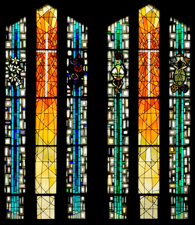 In the same chapel are many windows that are either entirely non-figurative or with small hints of symbolism. This one looks like the lilies often carried by St Joseph