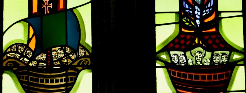 Both photographs above are from the Church of St Michael, Blackrock, Cork. The windows comprise large areas of breakouts with small images placed in the top half. A close up of the pictures chosen for this window reveal Noah’s Ark and Christ Calming the Waters (Contrast this with our final photograph in this post, which is in Caheragh)
