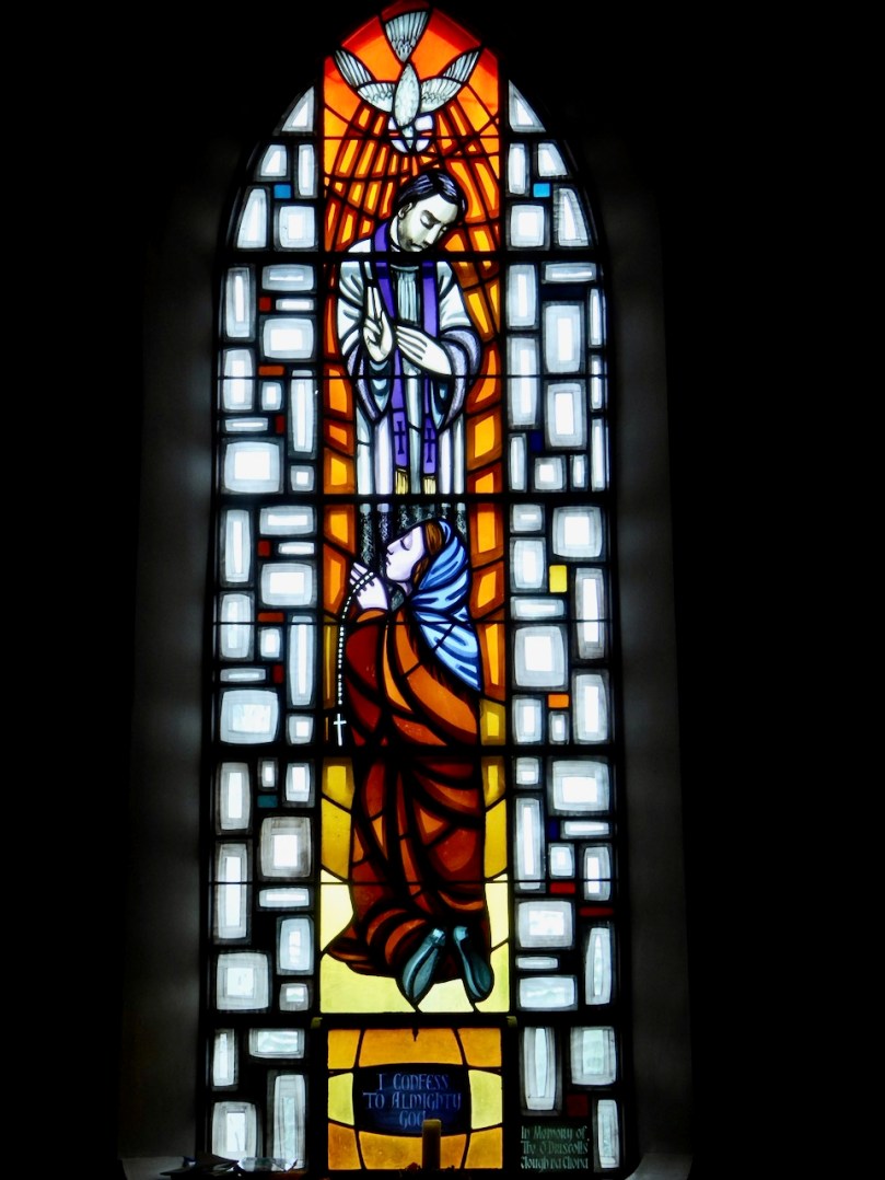 This window is a whole family project. It dates from 1974: Róisín painted the figure, Johnny did the little scene of Gougane Barra and Réiltín did the lettering. It’s in a convent chapel in Crosshaven, now closed and inaccessible. The photograph is published with the permission of the Presentation Order.
