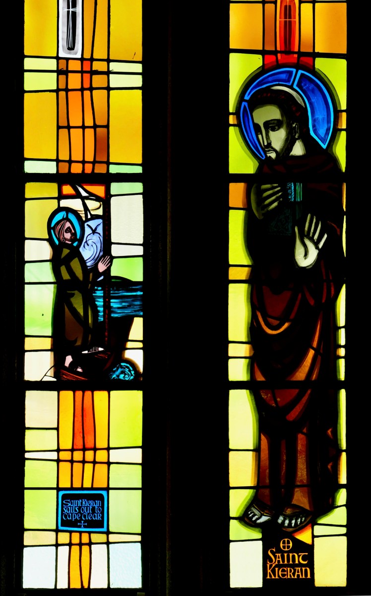 At Caheragh (north of Skibbereen) and Rath (just outside Baltimore) in West Cork two small rural churches demonstrate how well he succeeded. The windows in each are quite different, although both were completed in 1963. In Caheragh the figures are situated in the lovely wavy-lined breakouts that we saw Murphy Devitt use to such effect in Mayfield, in tones of red and yellow.