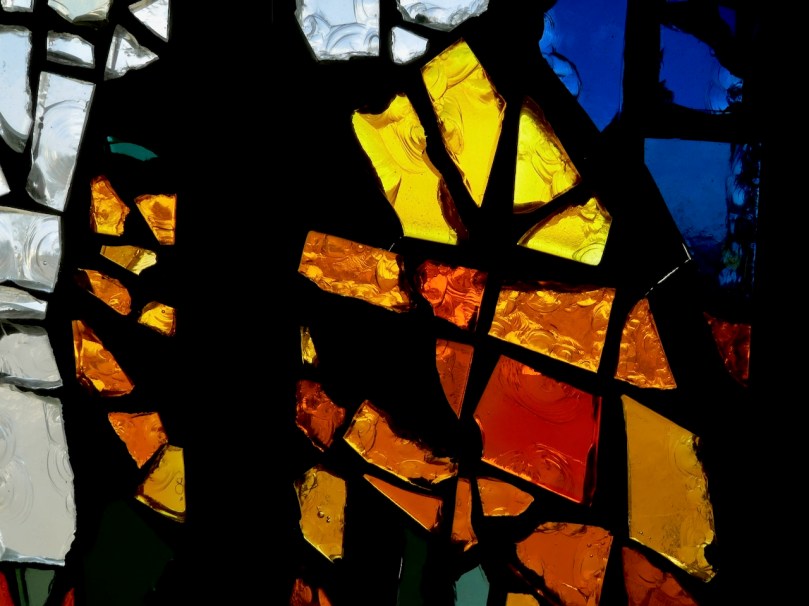 Some have small elements within them that are complete pictures, mostly Christian symbols, sometimes mere hints. There were favourites – I’ve seen similar ones crop up here and there, although their context leads to fresh treatments. Some churches are a mixture of figurative and non-figurative. Although it’s not in my remit for these posts, if you are near Dun Laoghaire visit St Michael’s church and marvel that expanses of ‘coloured glass’ can create such a calm and devotional atmosphere.