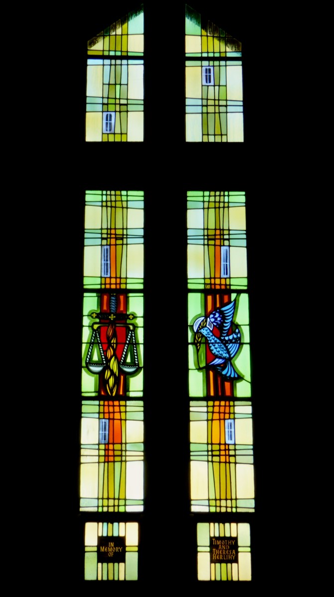 These mostly or entirely non-figurative windows became one of the hallmarks of Murphy Devitt Studios, instantly recognisable, and capable all by themselves of creating an atmosphere of drama or tranquility. An oval becomes the window to the soul, a series of them leads the eye upwards, thus capturing the notion of the elevation of thoughts and prayers. A sunburst denotes the glory of creation, light falling from heaven.