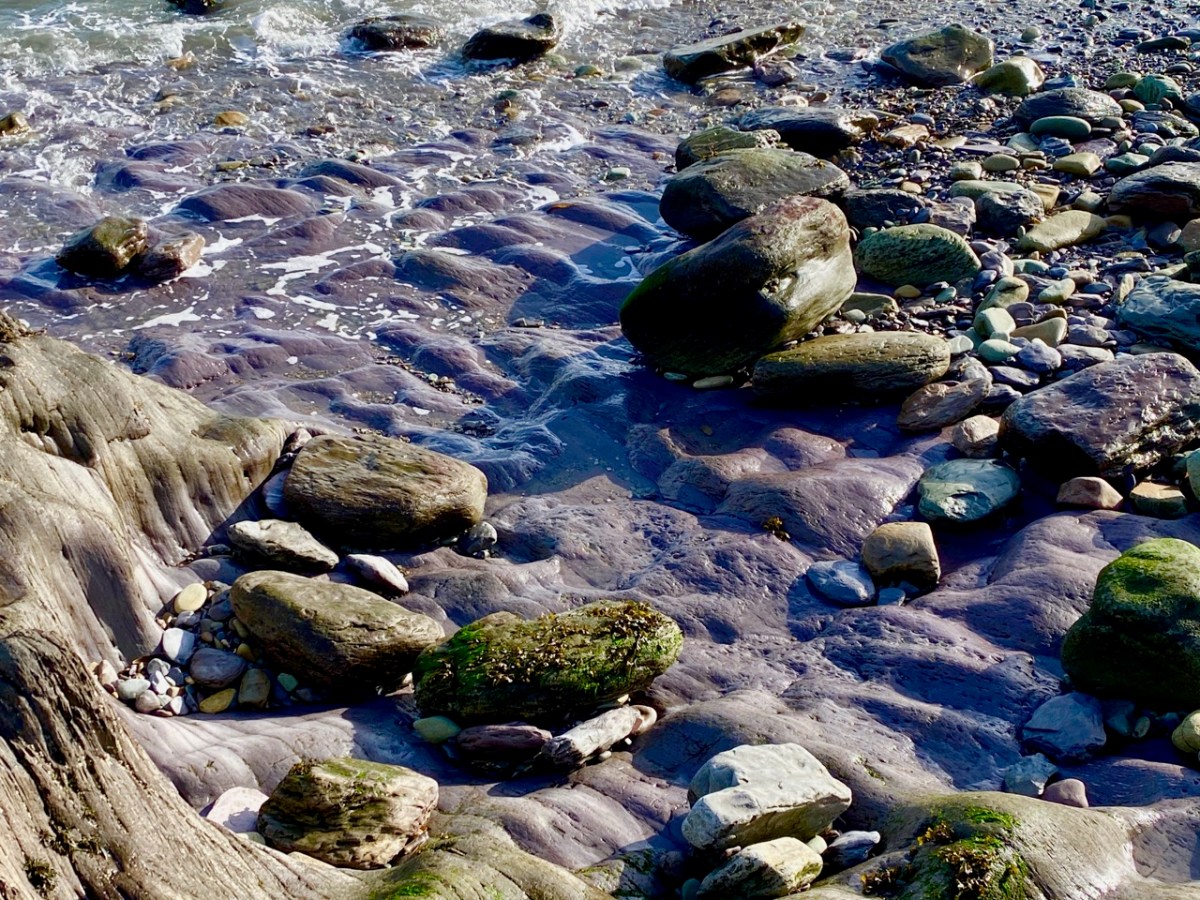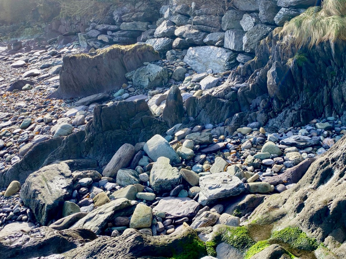 Old Red Sandstone: in fact it varies in colour depending on its local history. Broadly, some of the mountain rocks are purple-grey, while those closer to the sea could be greeny-red, but that is probably far too wide a generalisation. The sheer beauty is in the infinite shapes and colours. What artist needs any finer palette?