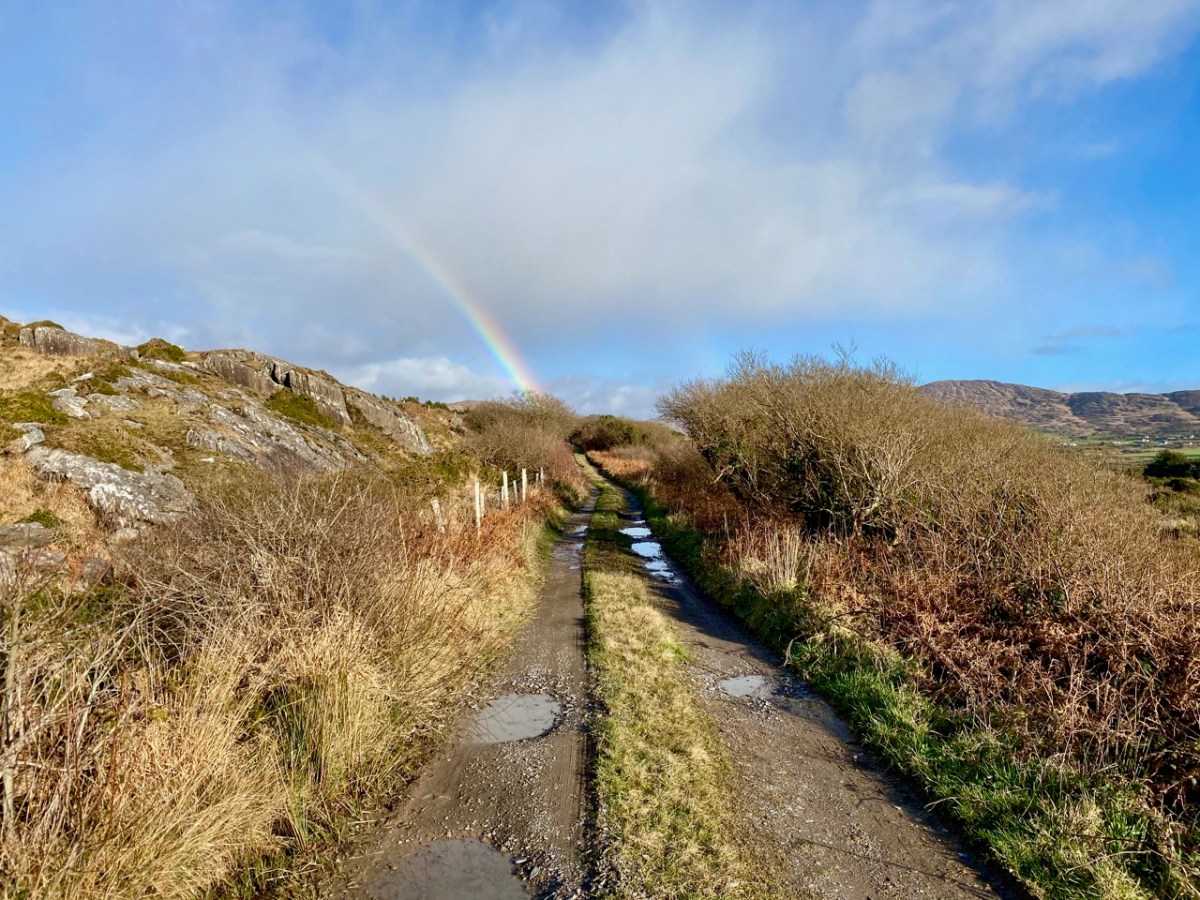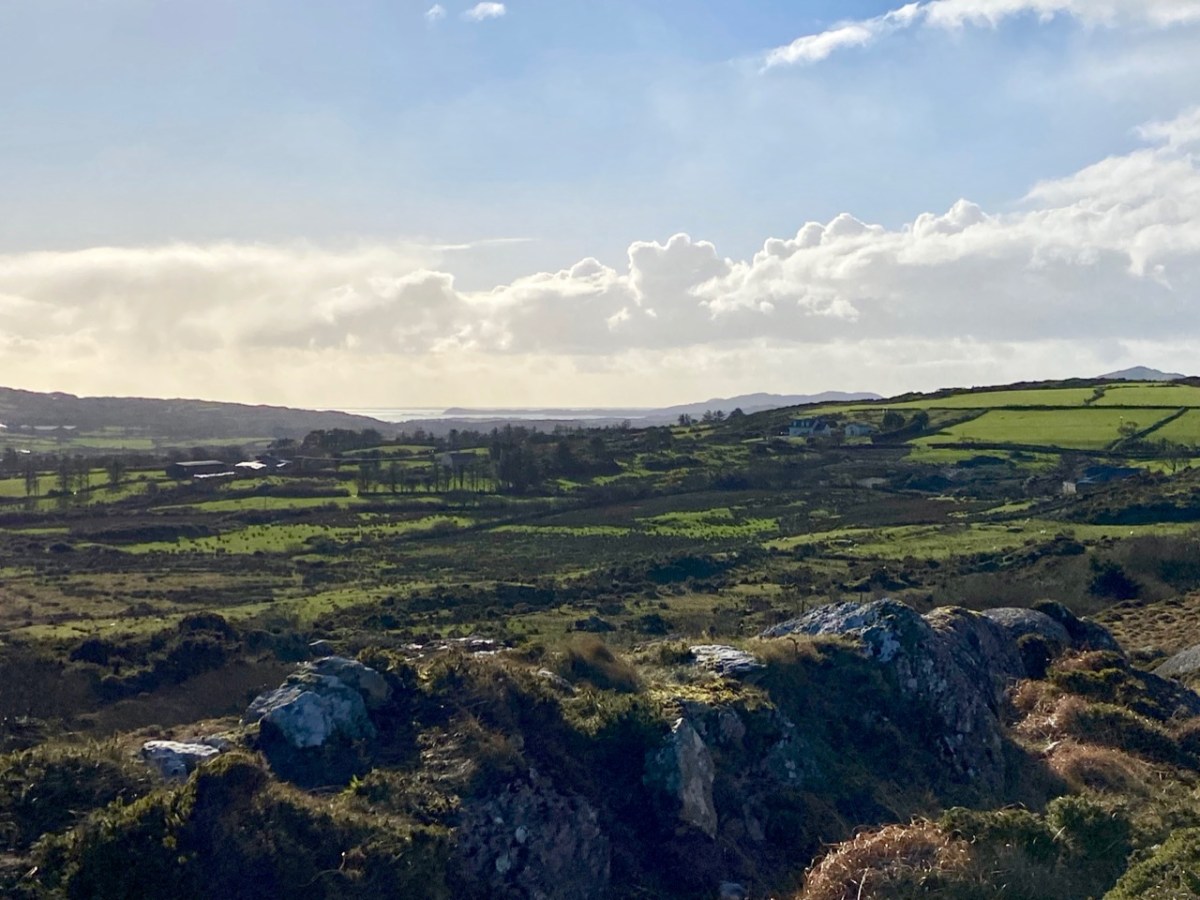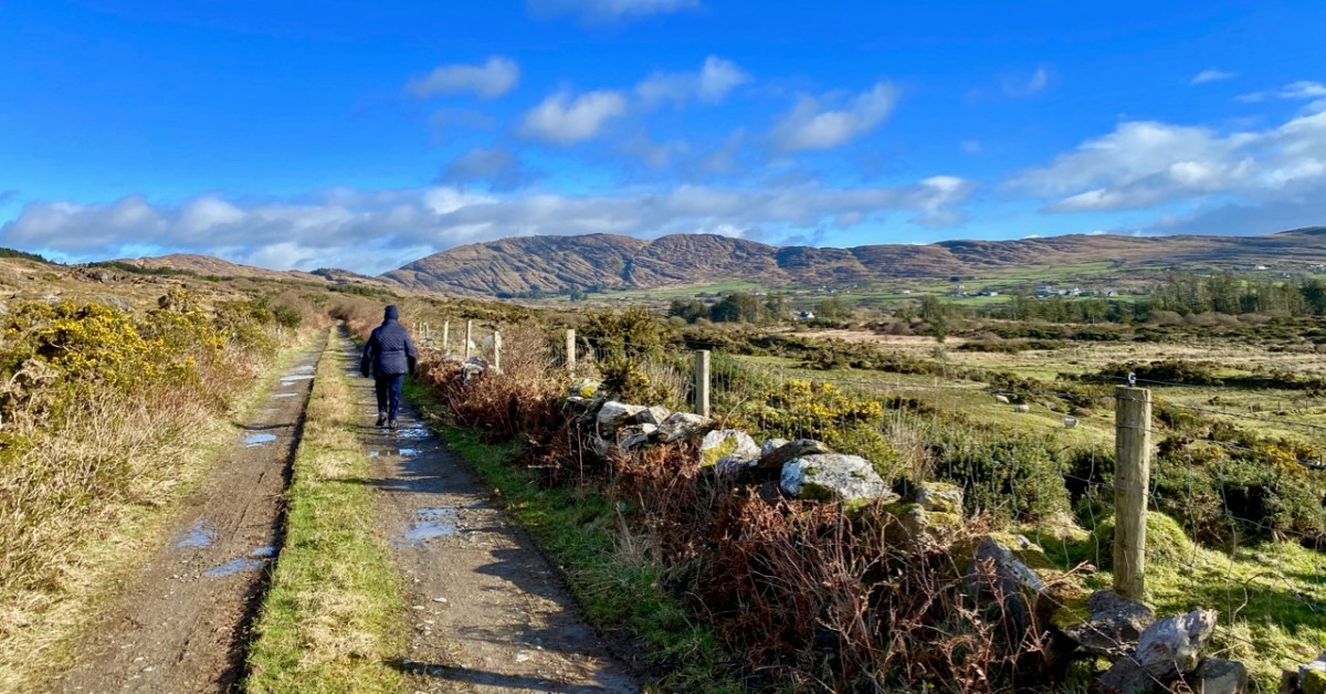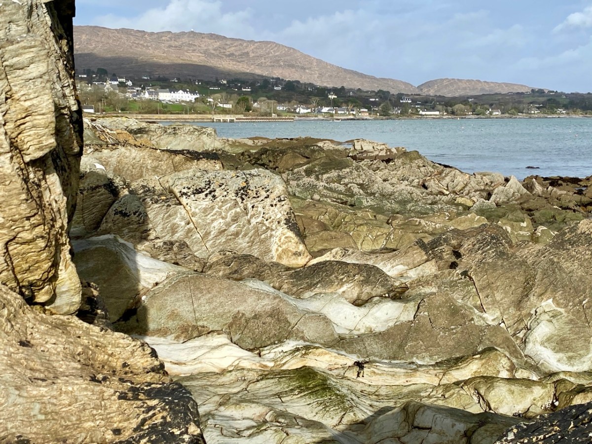 It certainly does! But this post is – literally – about rock: the hard, knobbly kind that is underneath us, surrounds us, and which has historically built our environment. In the picture above, taken on a clear February day during the most severe Covid lockdown, Finola is walking through beautiful West Cork. Beyond her is the great, gaunt outcrop of Mount Gabriel. Beside her is a traditional stone wall: its design unchanged over centuries. In the landscape all around her are rocks – large and small – scattered in the rough pasture.