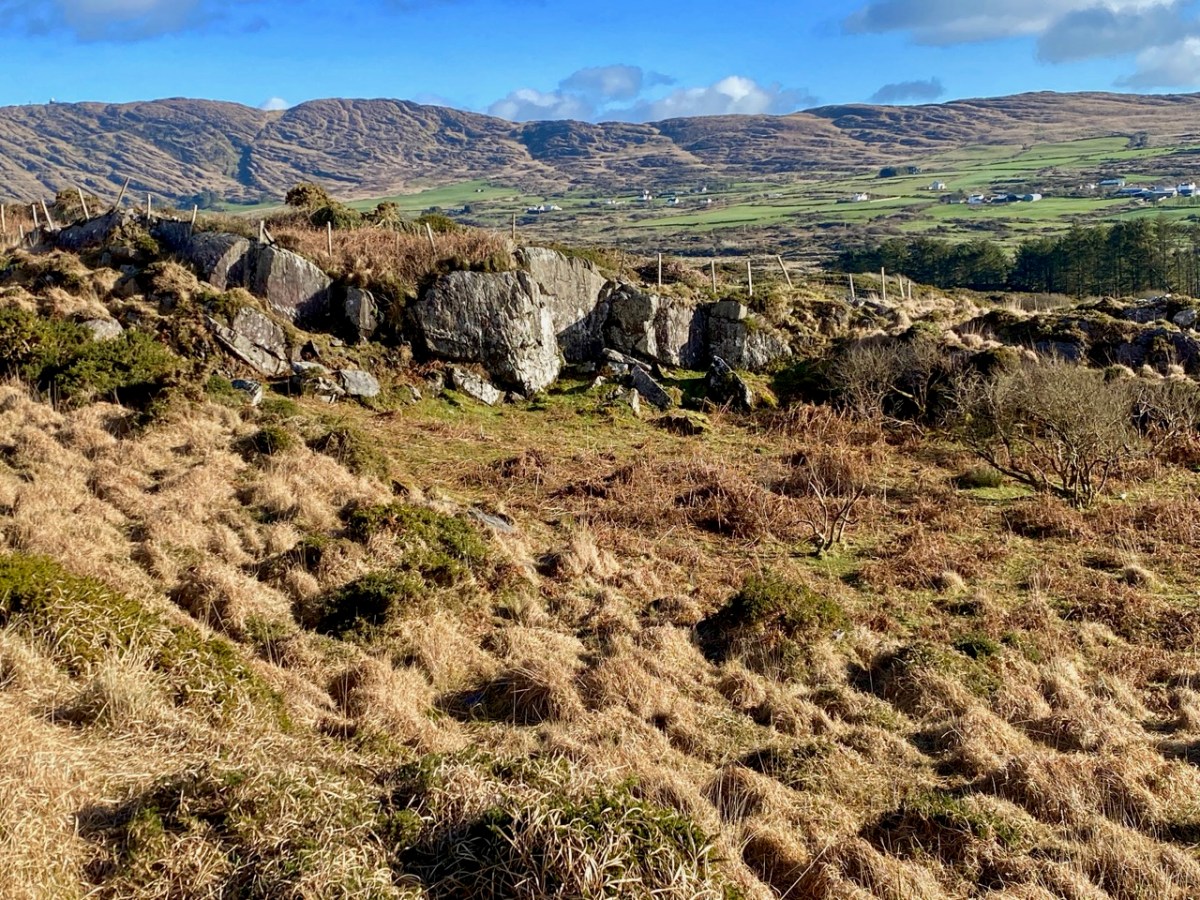 Today’s choice is a beautiful little example in the townland of Ratooragh, which is on the slopes of Ratooragh Mountain, north of Mount Gabriel. The location is fairly typical – on rising ground with good views in several directions.