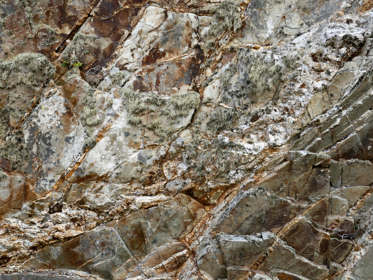 From there we wandered down to the main site and the powder house, and then to the opencast workings. I’m not quite sure which period this belongs to or what they were looking for in this working. The rock face is heavily grained with quartz but also now with lichen, after so many years.