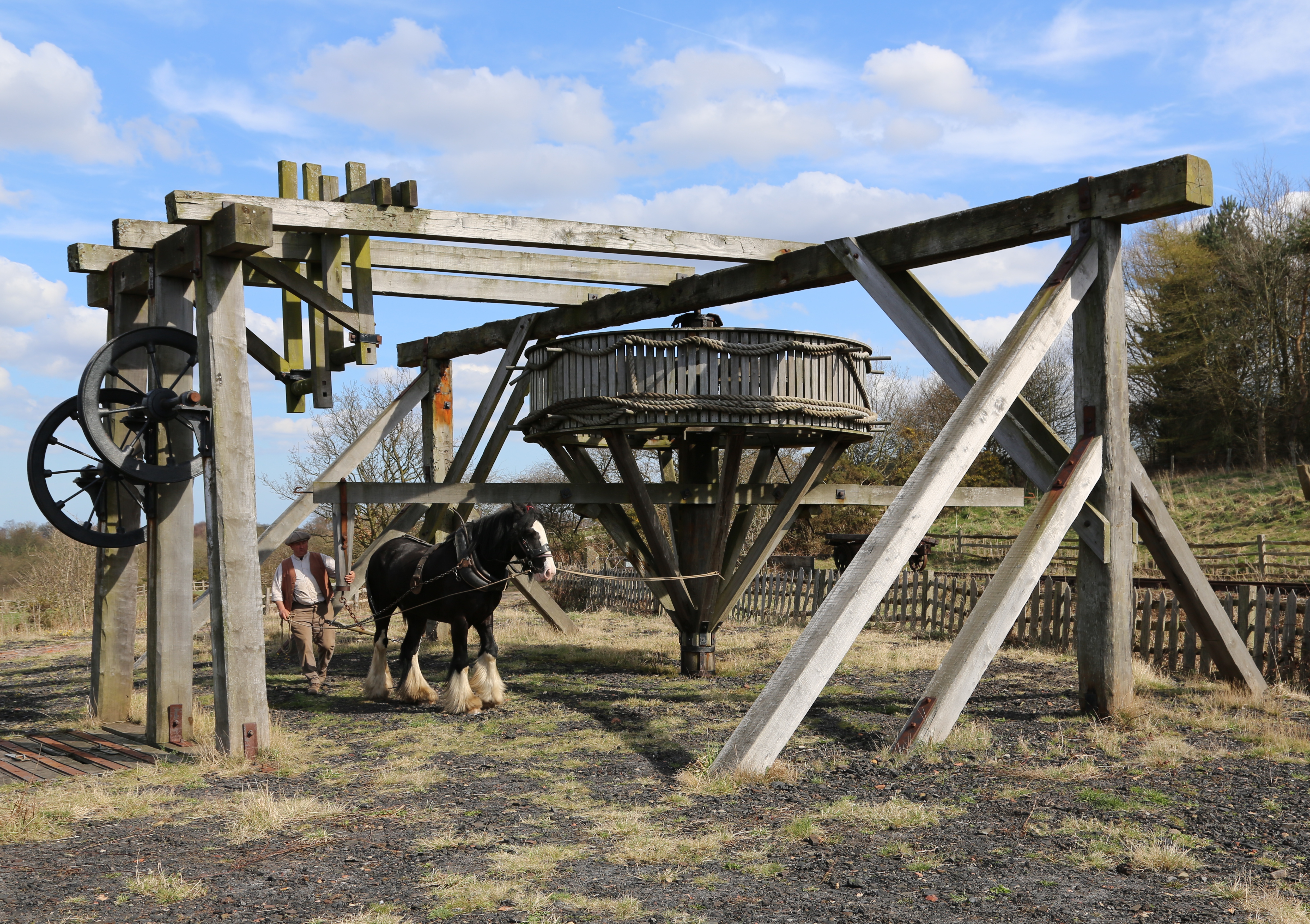 This is a photograph of a horse-powered whim, used for drawing up materials to the surface. This photo is from the Beamish Museum, County Durham, England, and used under the Creative Commons license