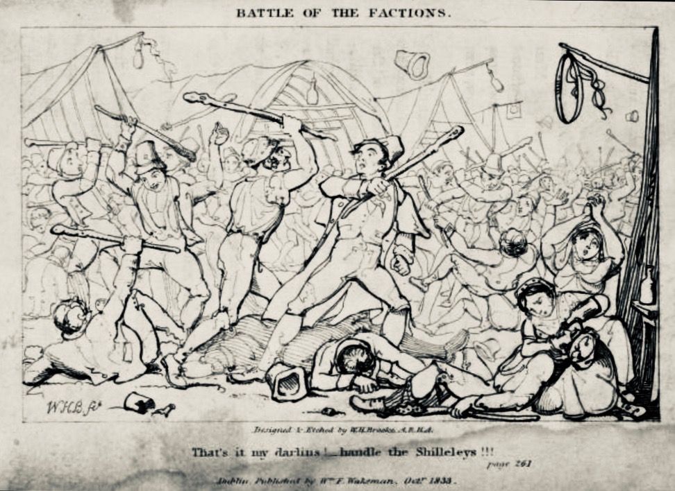 Faction Fighting, one of the evils that both Catholic and Protestants clergy railed against. The illustration, by W H Brooke, is from Traits and Stories of the Irish Peasantry by William Carleton
