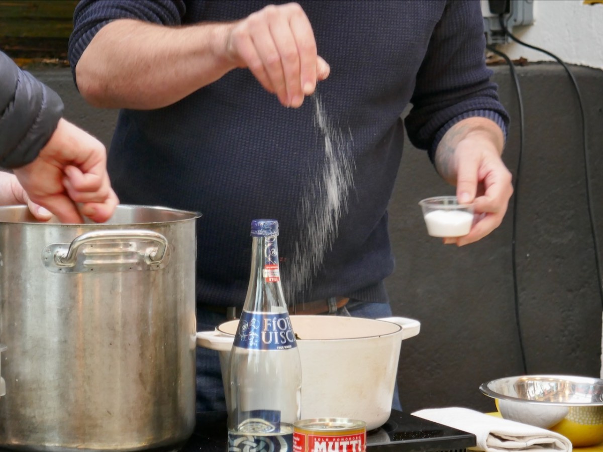 I said that one of the ingredients was tomatoes, and that’s correct. But there were two kinds – one kind was the fresh tomatoes on the vine that Rob roasted, the other was – canned! It’s important, he said, to look for good quality canned tomatoes that have been peeled – unpeeled can leave unpleasant bits in the soup. This one is available in Fields of Skibbereen.