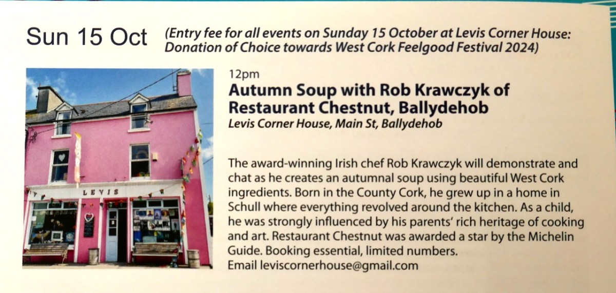 That’s Rob Krawczyk – our own Ballydehob Michelin starred Chef and owner of Restaurant Chestnut here in Ballydehob. He’s showing us how to make soup? I’m in!
