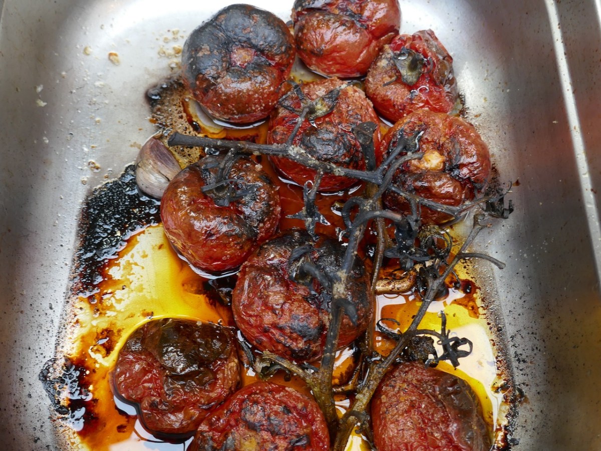 What did I learn that I didn’t know before? First, and most surprising to me – roast the tomatoes, vine and all! Roasting brings out the flavour, and apparently the vine itself also contains buckets of flavour too. Chuck in a couple of cloves of garlic – no need to peel or cut them up. He buys his tomatoes from Lisheen Greens – one of our local producers of vegetables.
